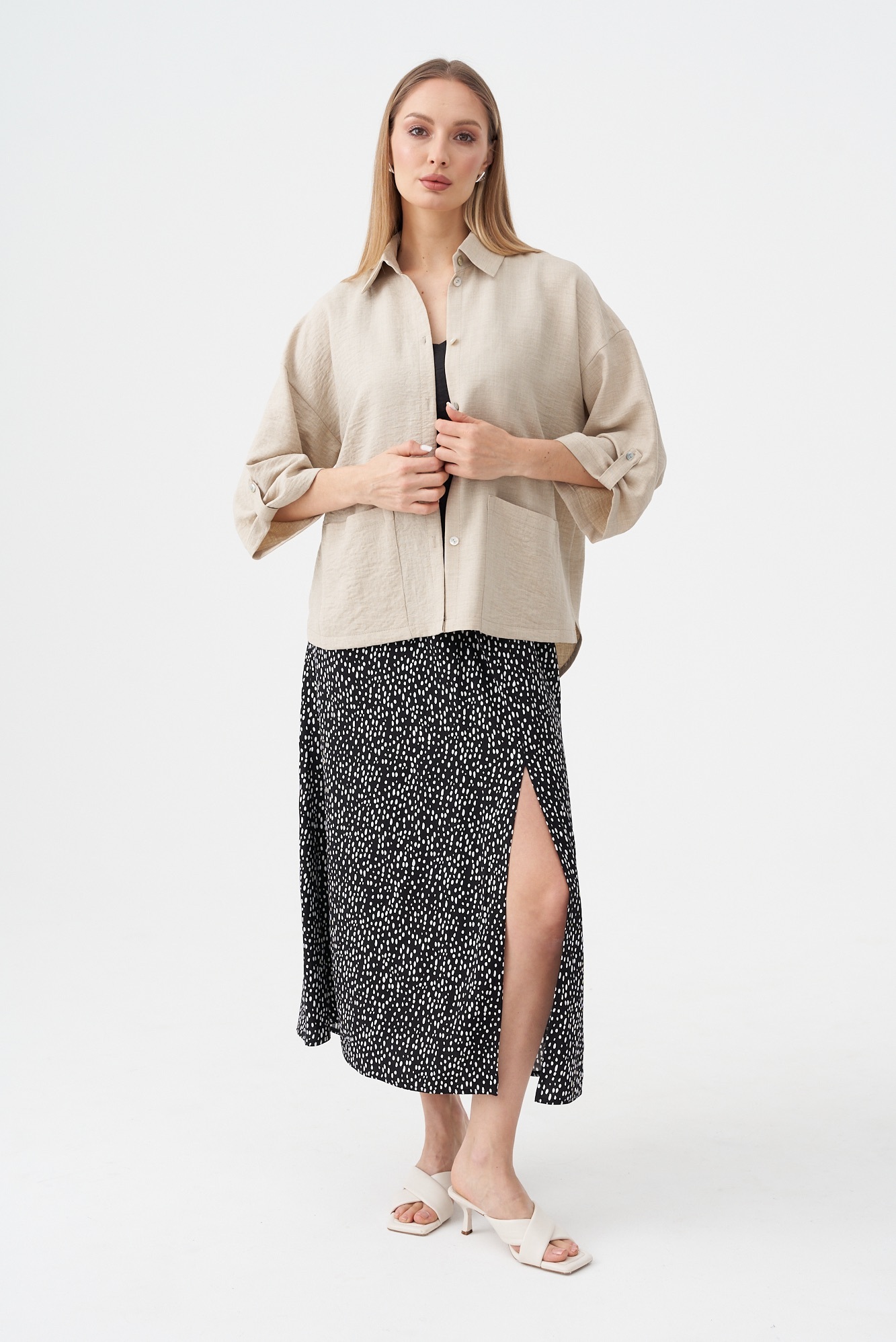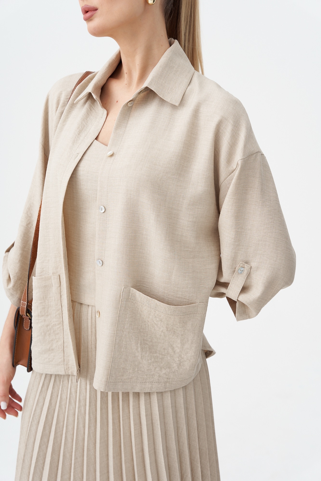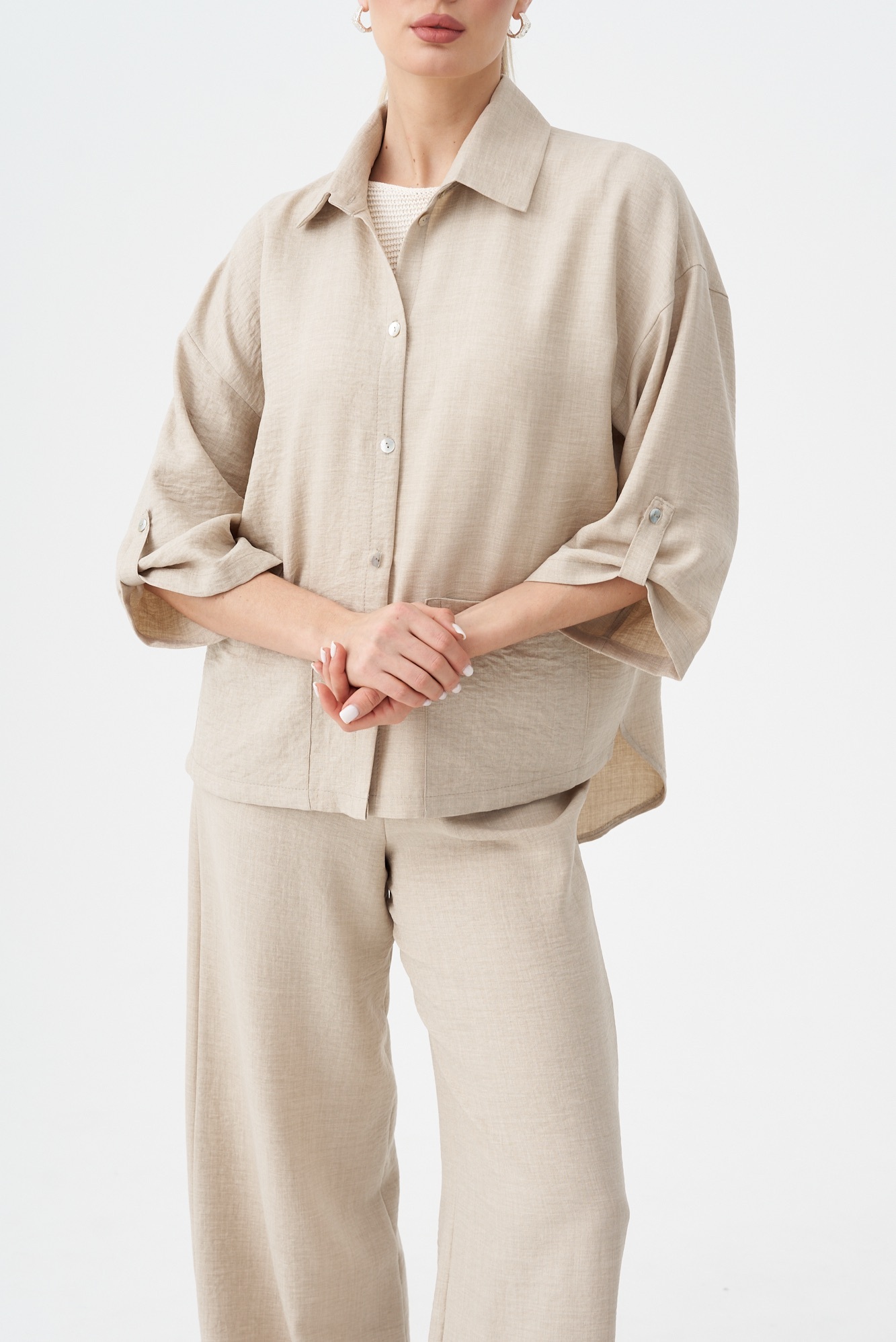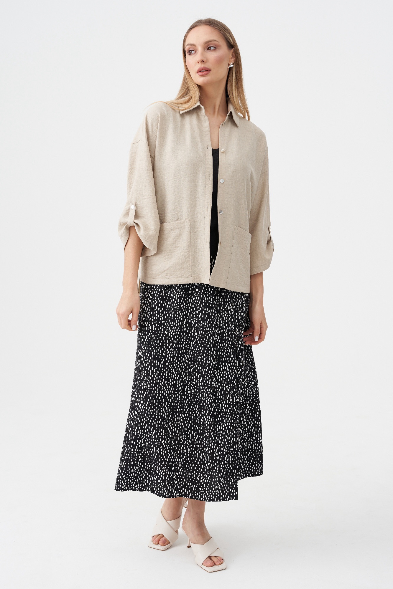 Рубашка-жакет свободного силуэта из легкой , слегка сжатой ткани, может стать базовой для вашего гардероба. Модель с рукавом 3/4, округлым низом и карманами. Спинка удлиненная. Хорошо смотрится , как верхний слой.