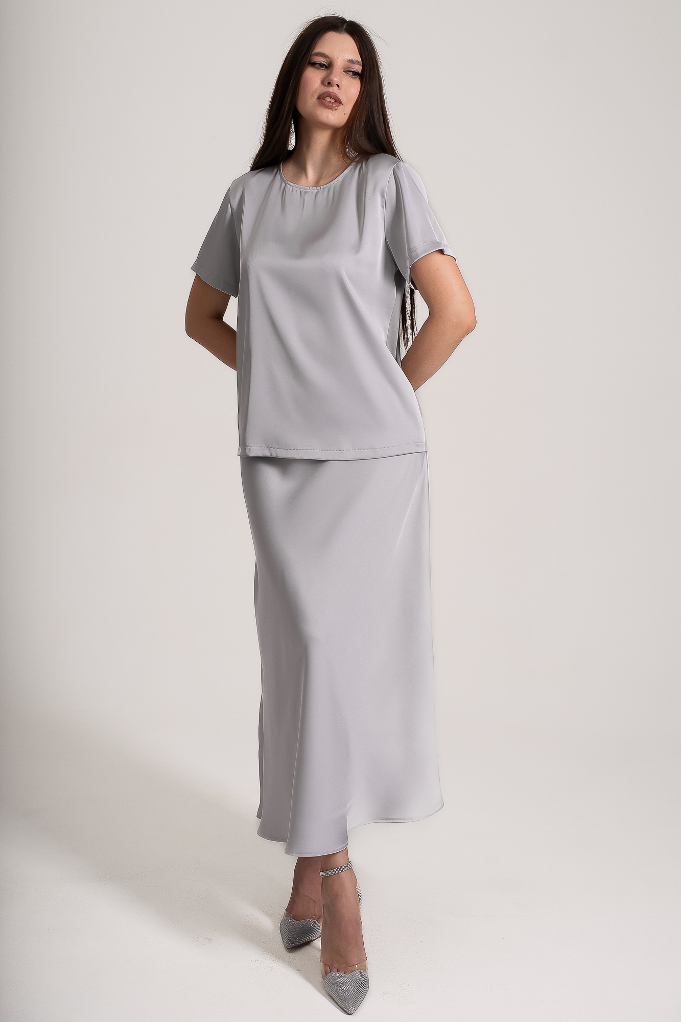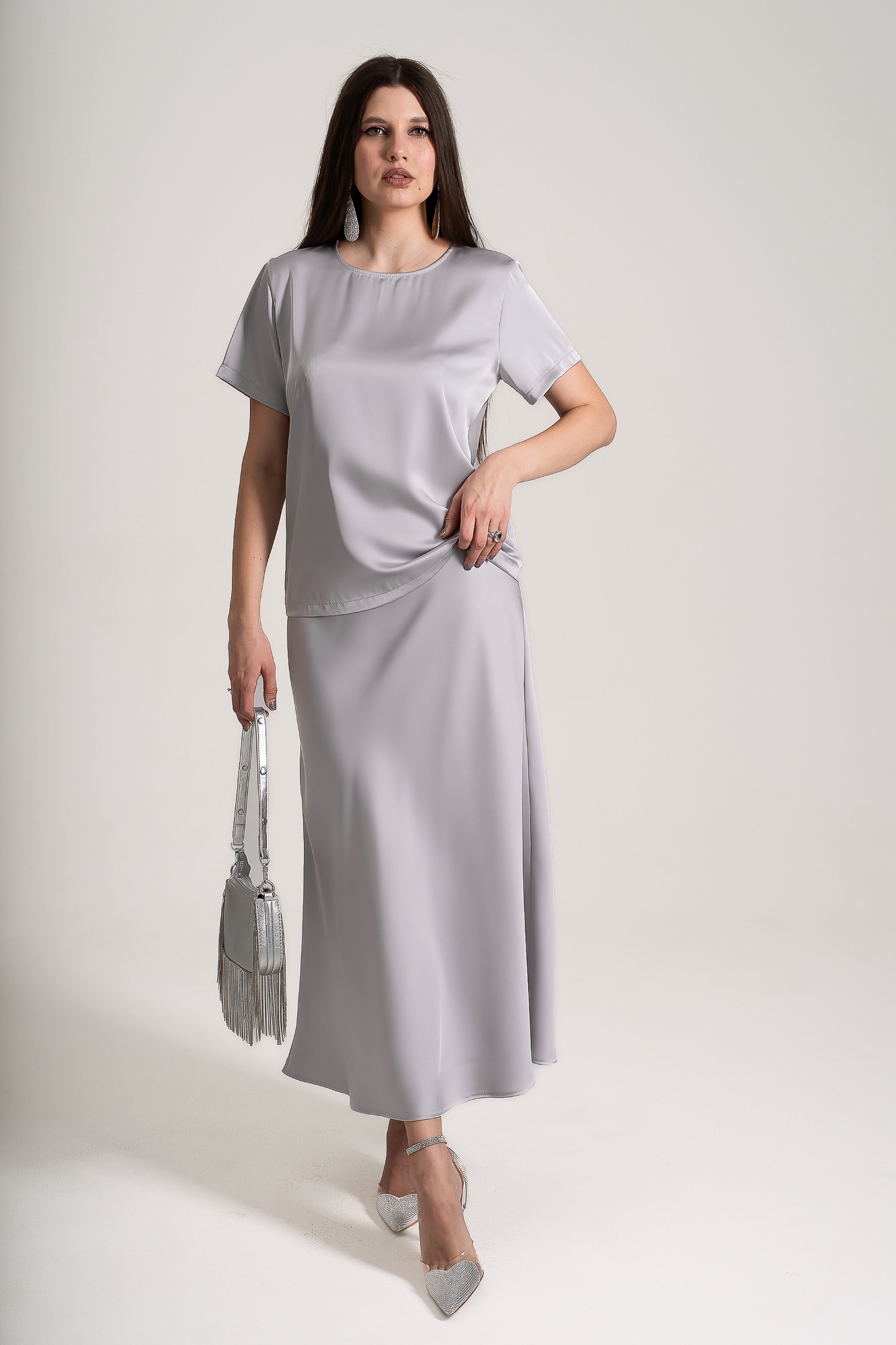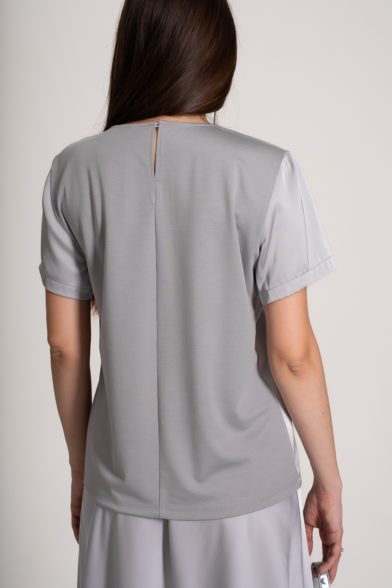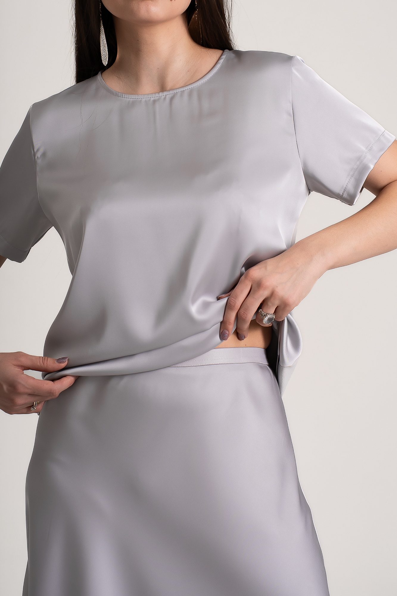 Блуза красивого жемчужного цвета может стать базовой и дополнить множество образов в разном стиле. Модель прямого фасона с коротким рукавом. Передняя часть блузы и рукава пошиты из шелковой ( атласной) ткани. Спинка трикотажная. Блуза выглядит стильно и нарядно.
