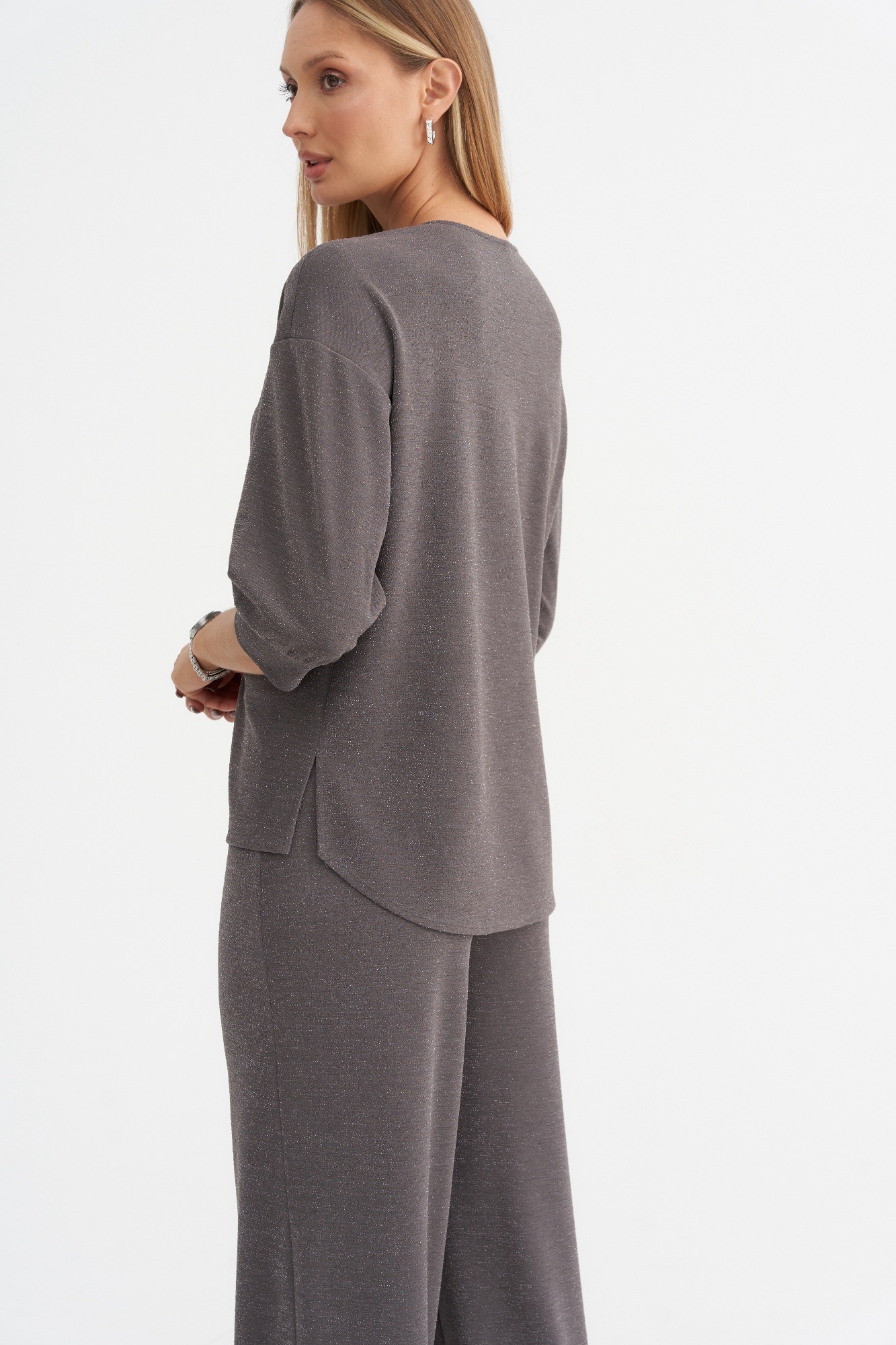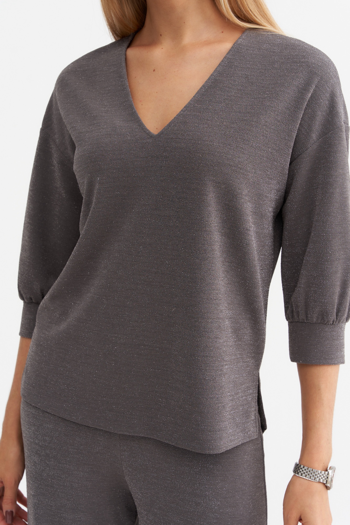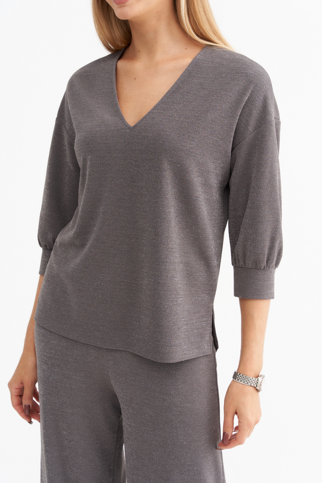 Блуза из трикотажа с люрексом отлично дополнит повседневный или праздничный образ. Модель с V-образным вырезом горловины и рукавом 3/4 на манжете. Блуза свободного прилегания с разрезами по бокам. Спинка удлиненная.