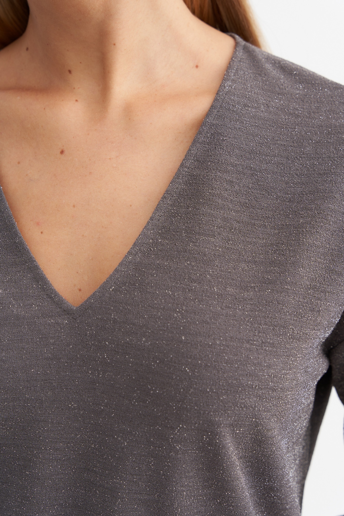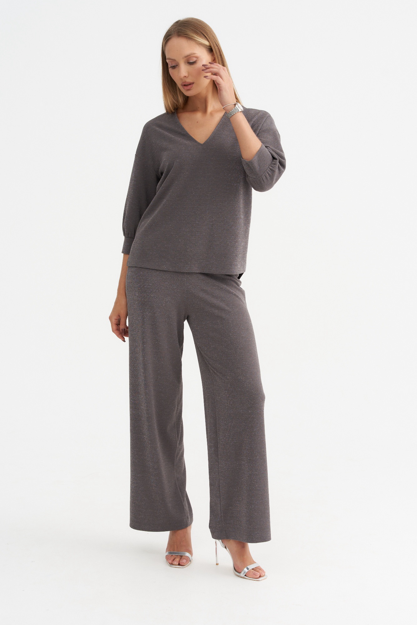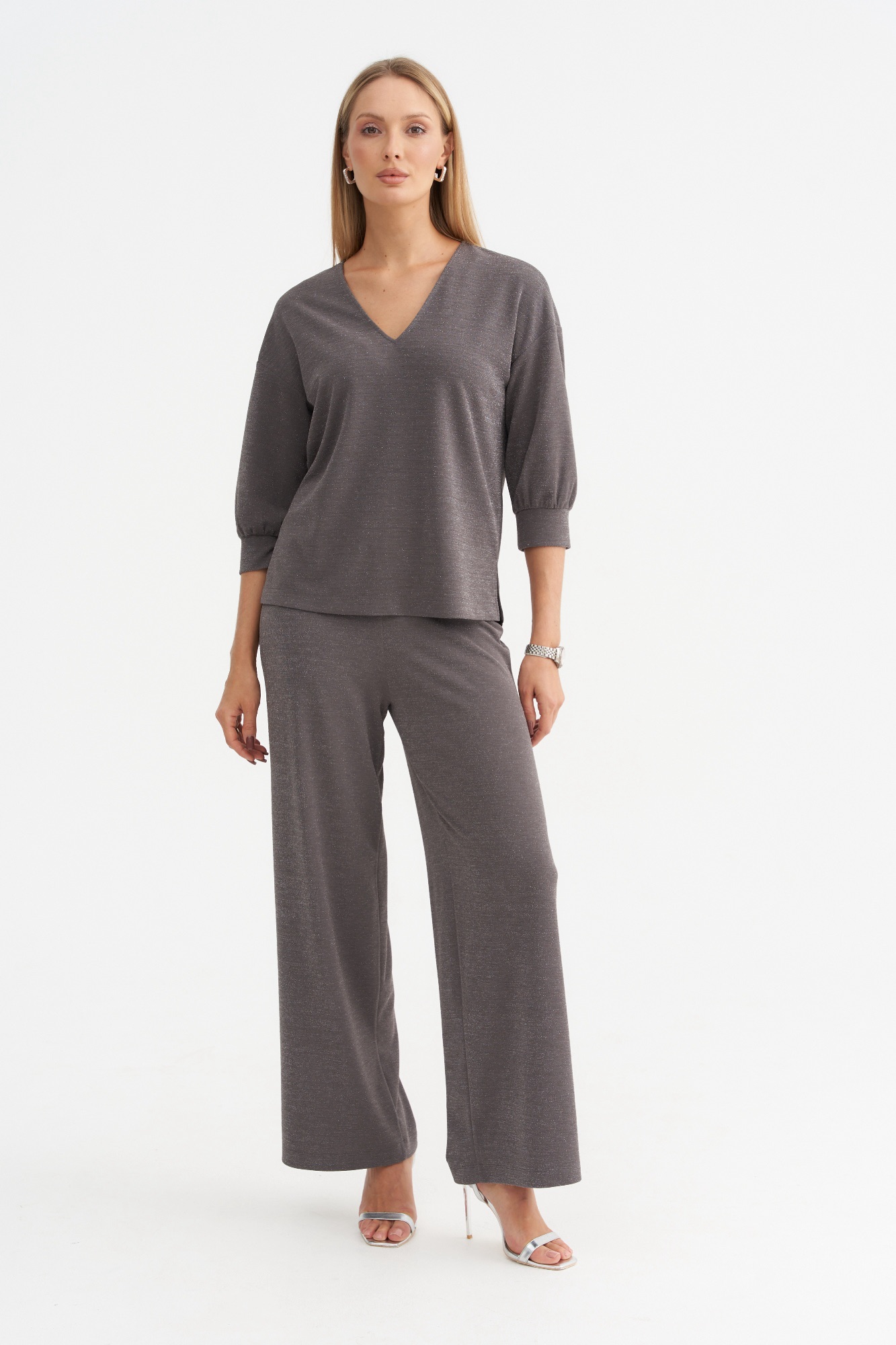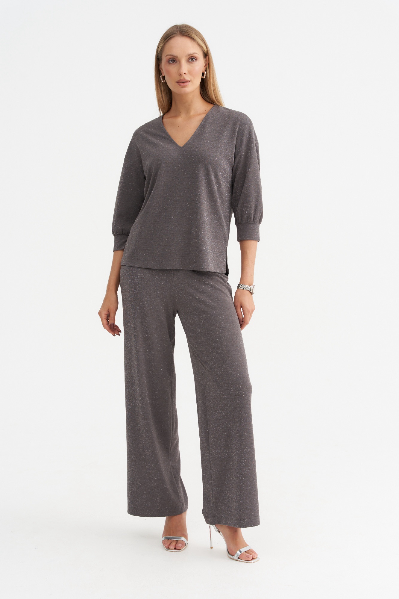 Блуза из трикотажа с люрексом отлично дополнит повседневный или праздничный образ. Модель с V-образным вырезом горловины и рукавом 3/4 на манжете. Блуза свободного прилегания с разрезами по бокам. Спинка удлиненная.