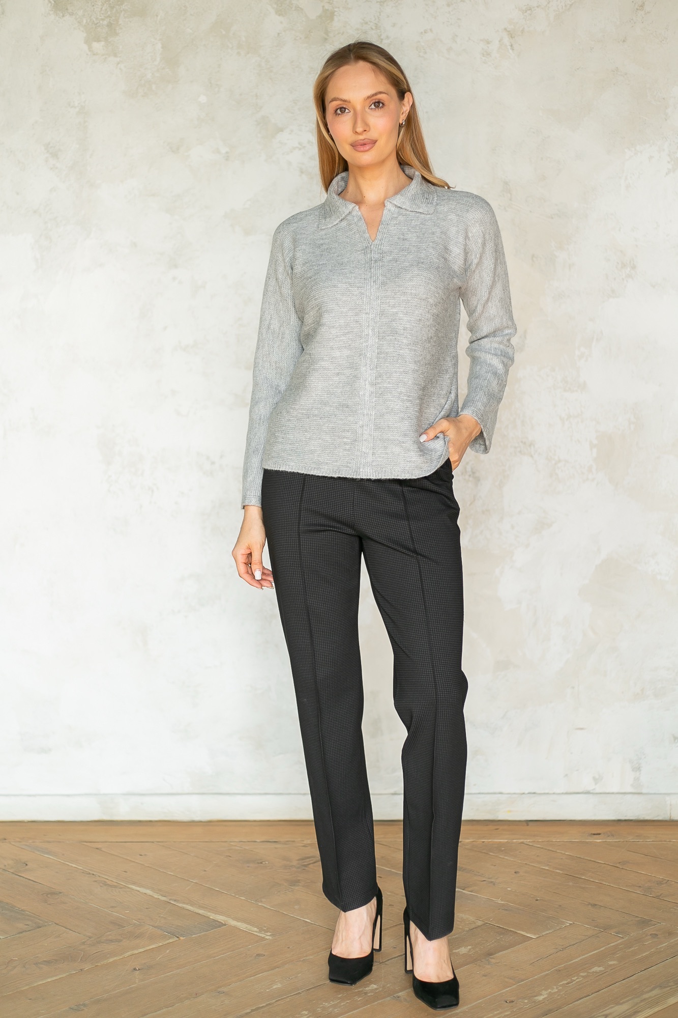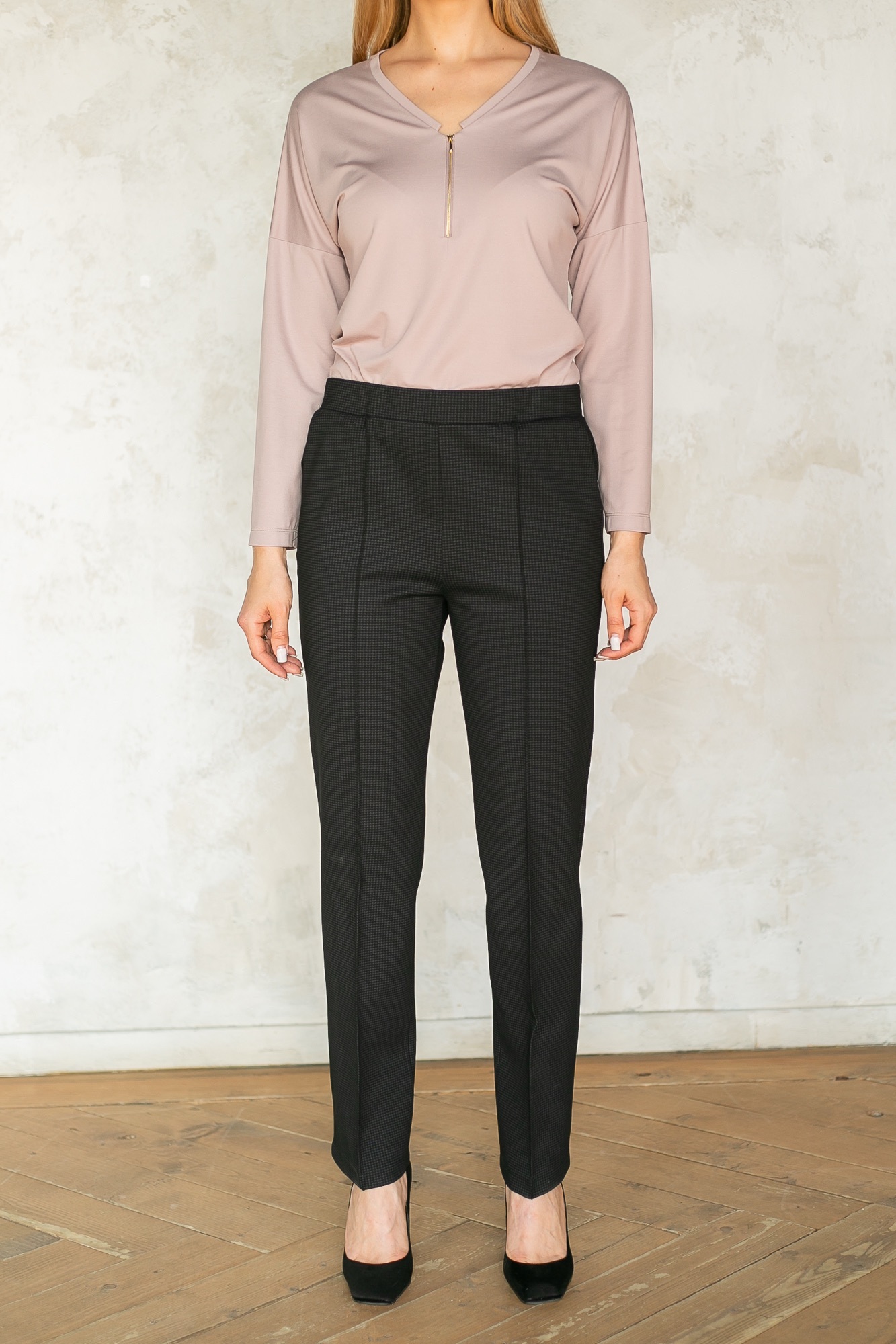 Брюки из плотной трикотажной ткани с застроченными стрелками станут незаменимыми в вашем гардеробе. Модель зауженная, с поясом на резинке и карманами. За счет ткани и правильного кроя брюки очень хорошо сидят по фигуре. Застроченные стрелки предотвращают возможность вытяжения в области коленей и придают брюкам всегда опрятный вид. Отличный вариант на осень-зиму. Брюки черного цвета с очень мелким рисунком «гусиные лапки»
