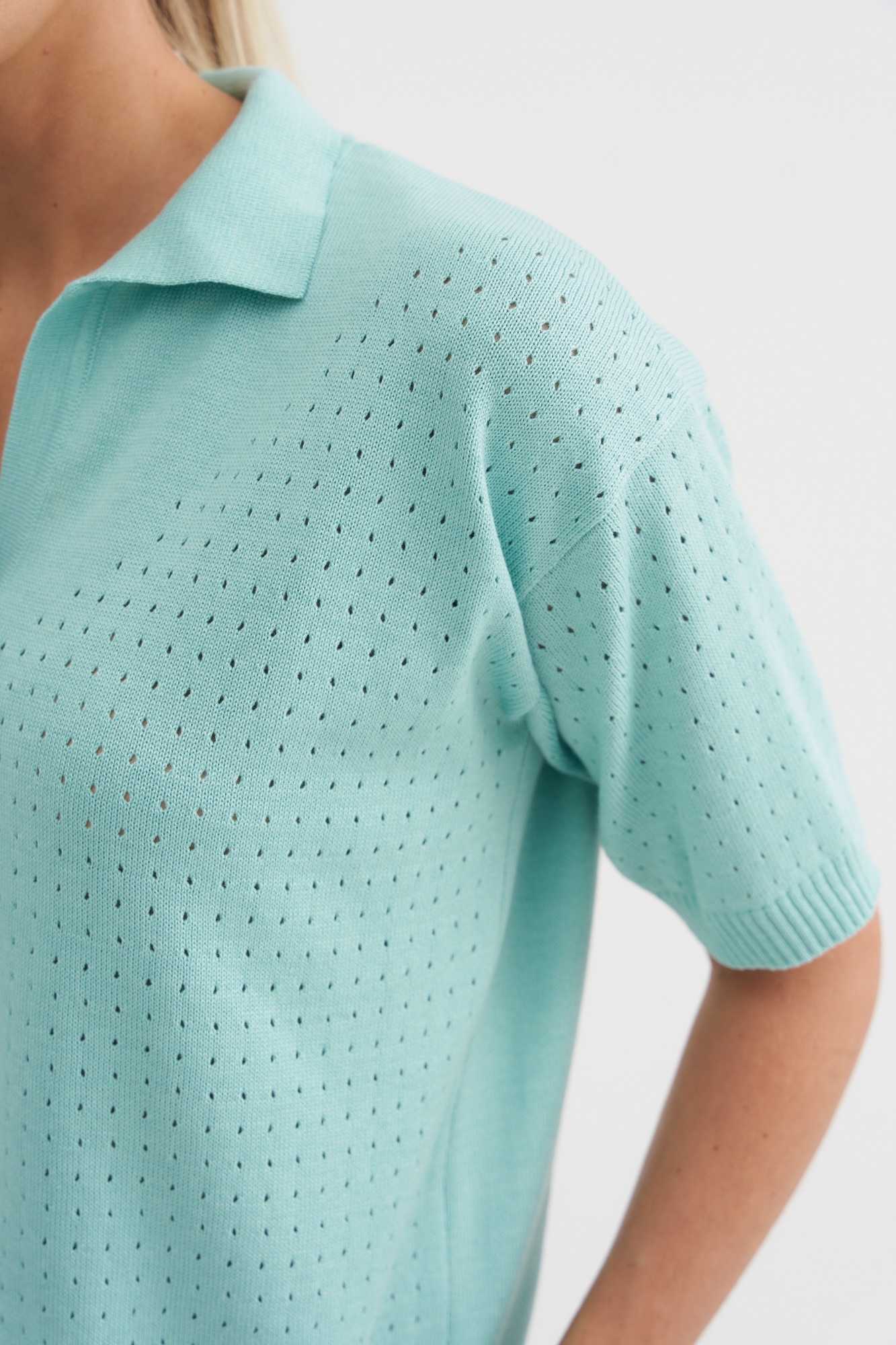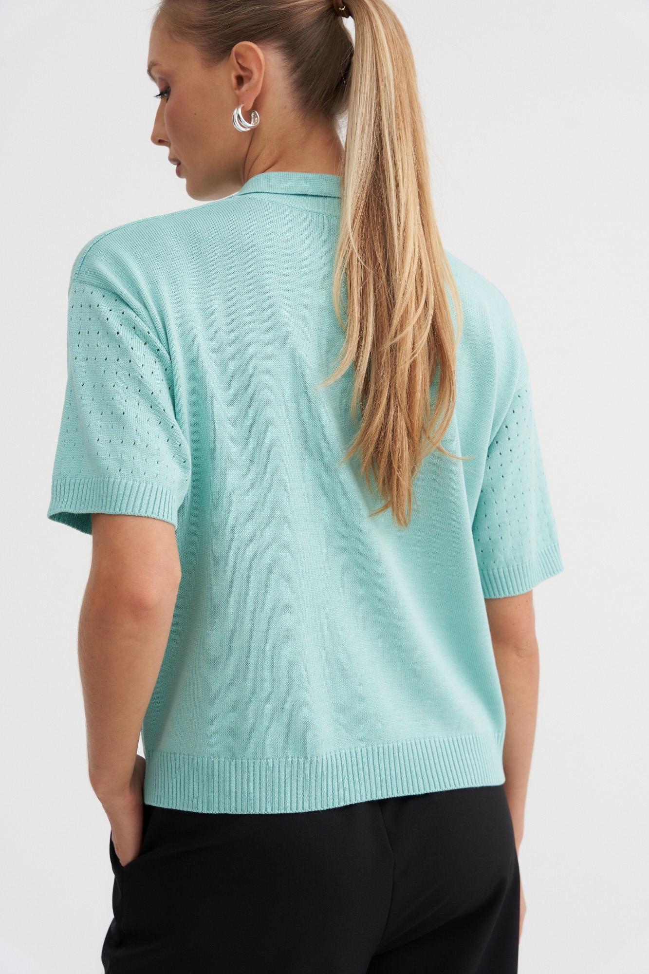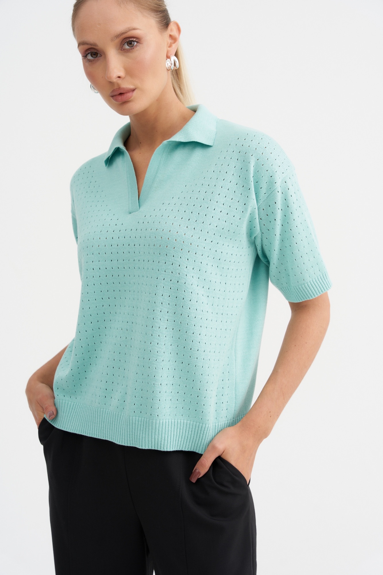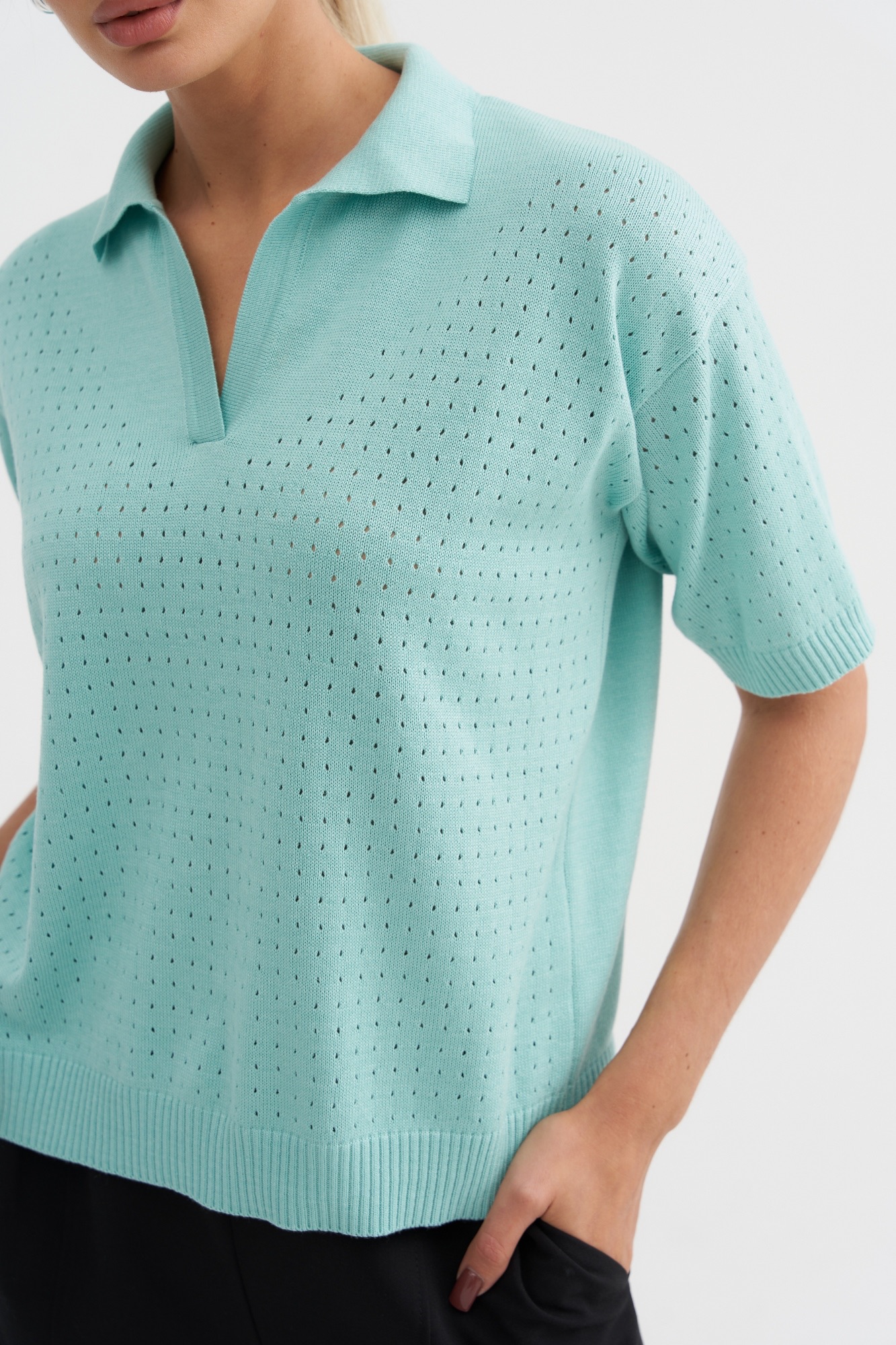 Стильный джемпер-поло может стать базовым в весенне-летнем гардеробе . Джемпер умеренный оверсайз с фактурной вязкой по передней части и свободным рукавом. Рубашечный воротник и вырез хорошо корректирует линию шеи. Отличный состав позволит чувствовать себя комфортно в любое время года.