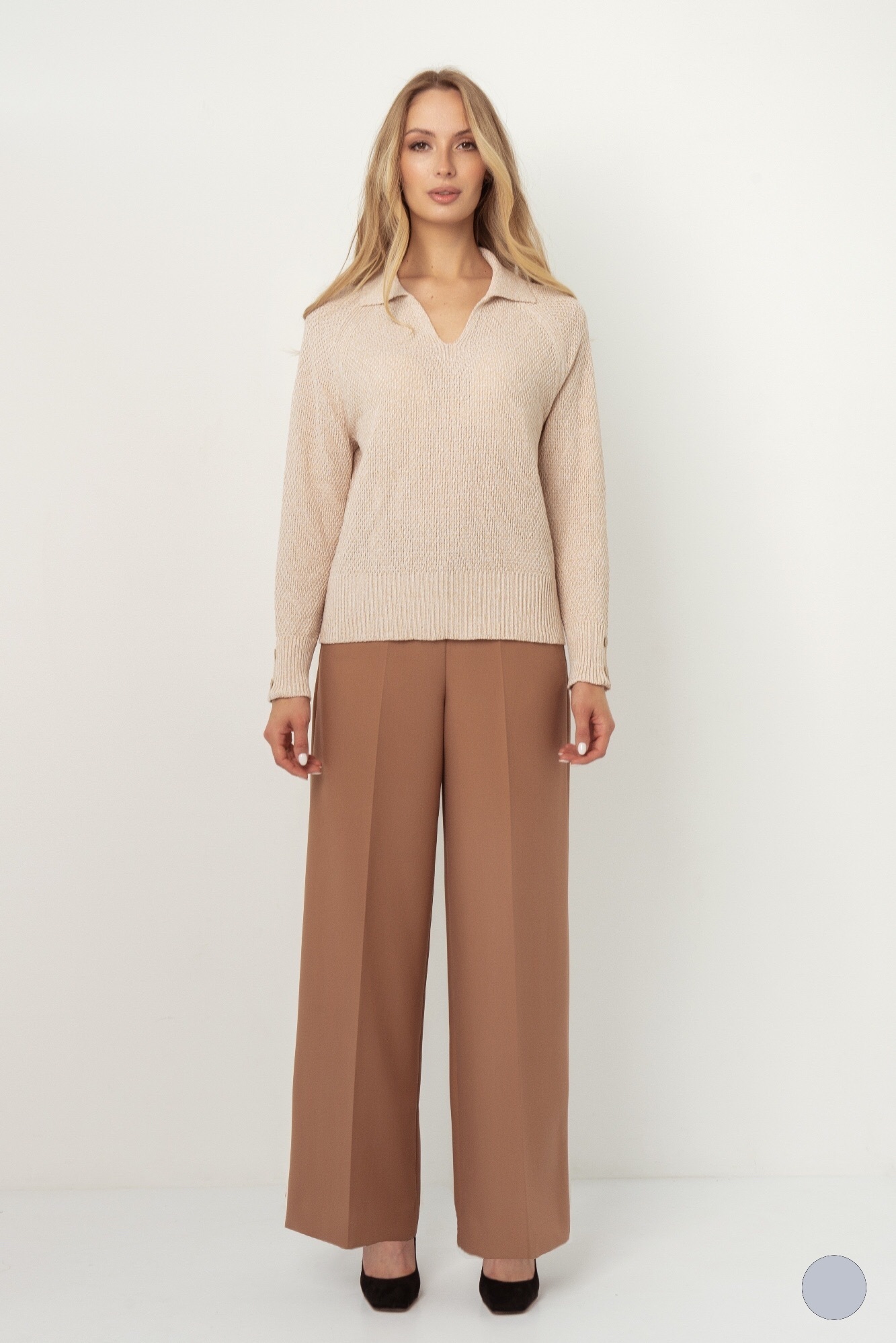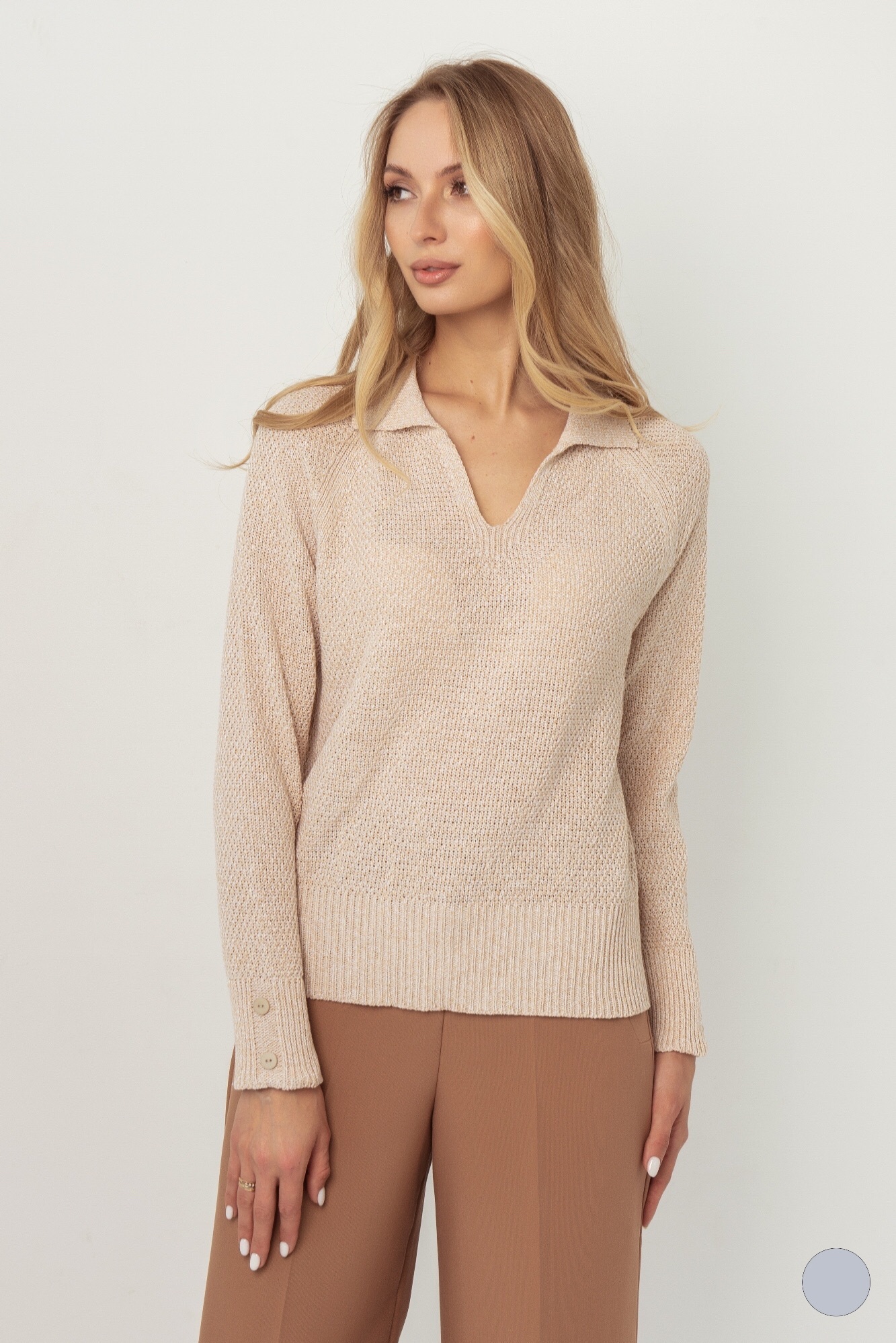 Джемпер свободного прилегания с отложным воротником поло отлично дополнит повседневный образ с брюками или юбками. Красивая вязка и трендовый фасон делают джемпер очень лёгким и свежим. Резинка по низу позволяет легко регулировать длину джемпера. Воротник и V - обратный вырез хорошо корректирует линию декольте, подчёркивает стройную или удлиняет короткую шею, придаёт свежести лицу.