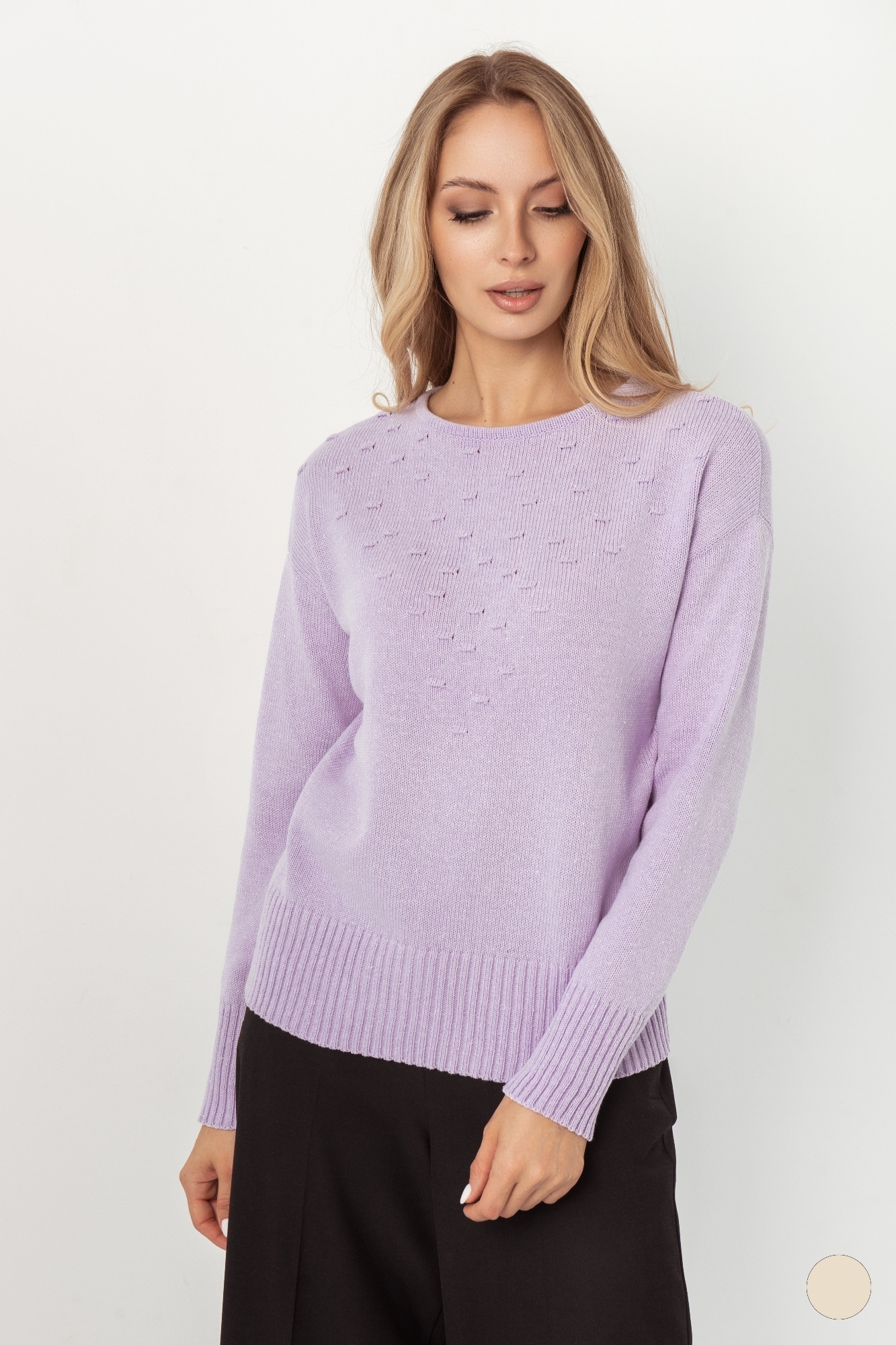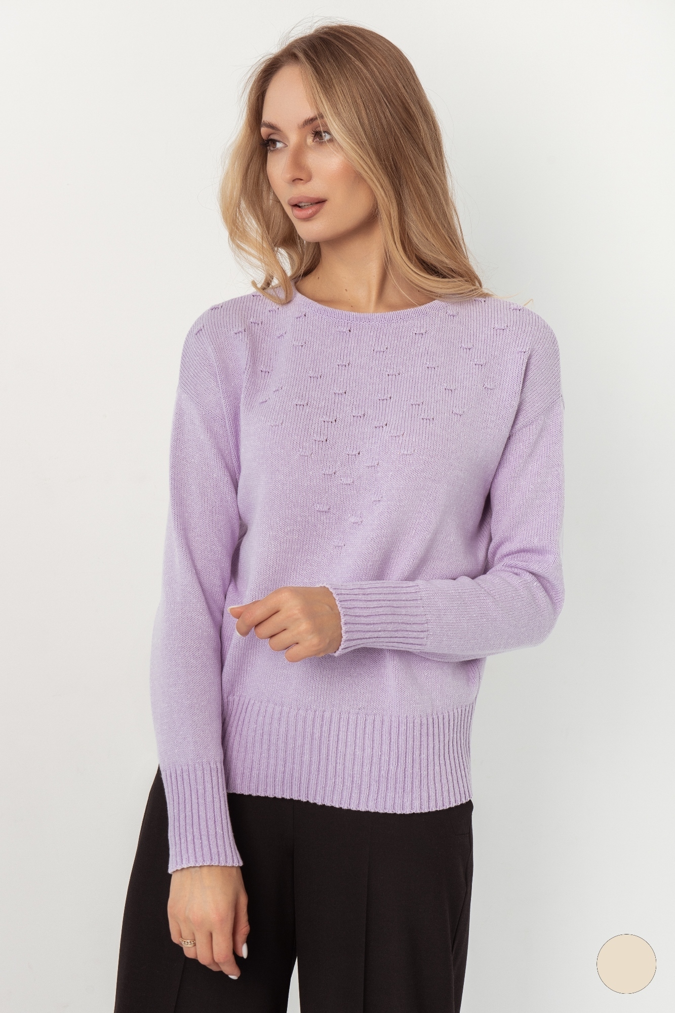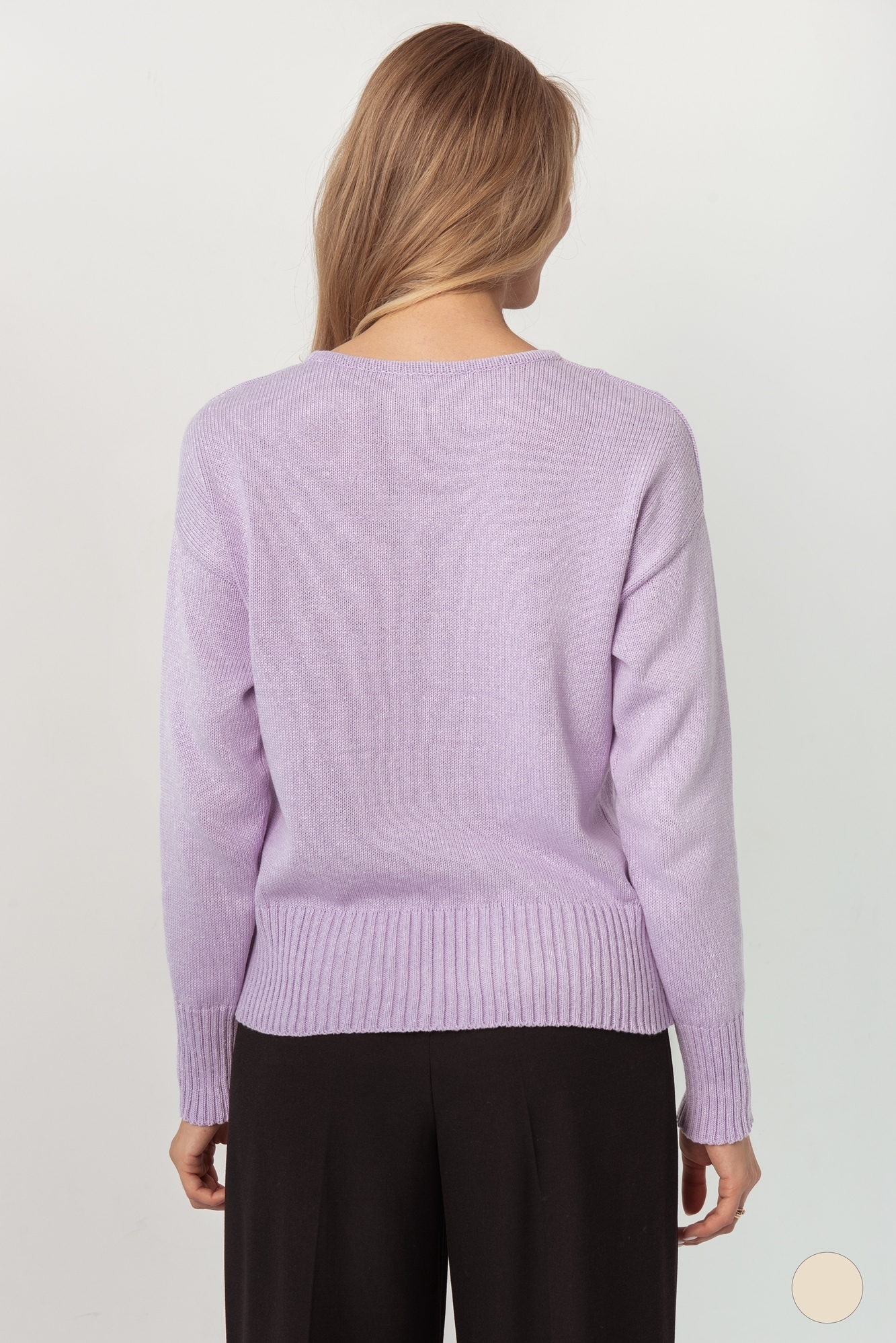 Великолепный джемпер нежного сиреневого оттенка подчеркнет вашу женственность и отлично дополнит осенне-зимний гардероб. Модель имеет небольшой крыглый вырез и резинку по низу, с помощью которой можно регулировать длину. Хорошо смотрится, как с брюками или джинсами,так и с юбками.