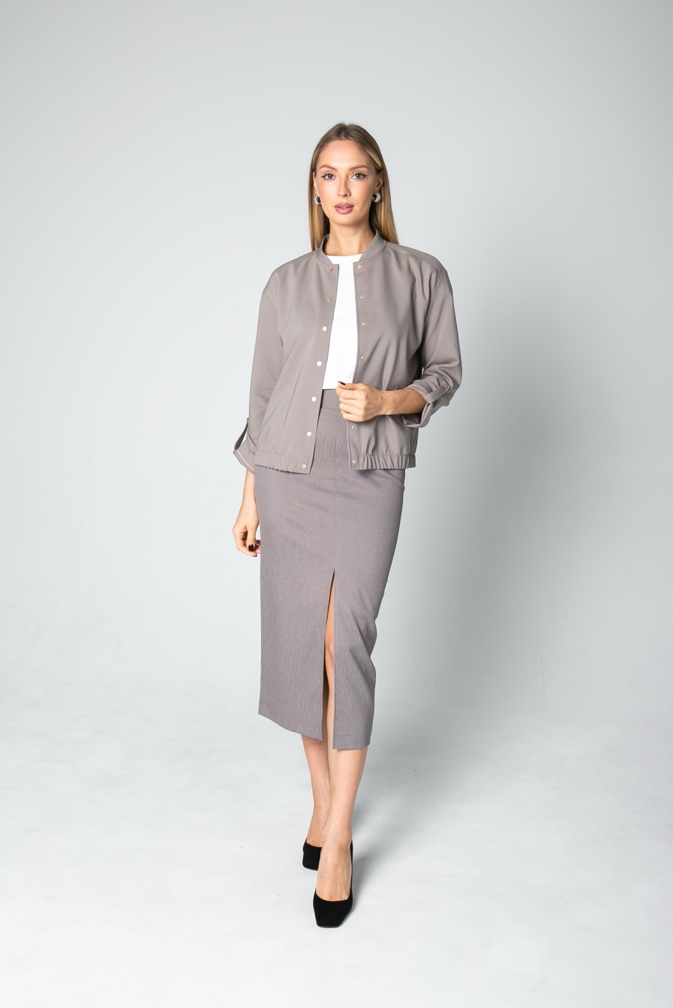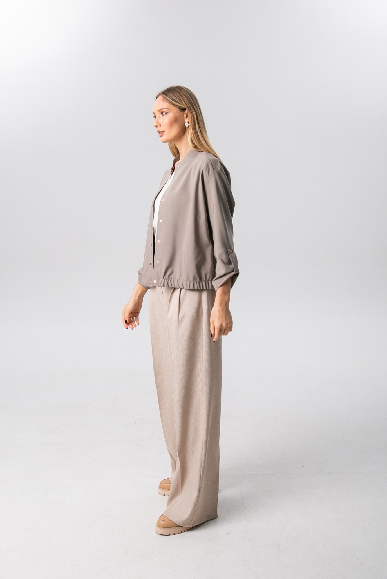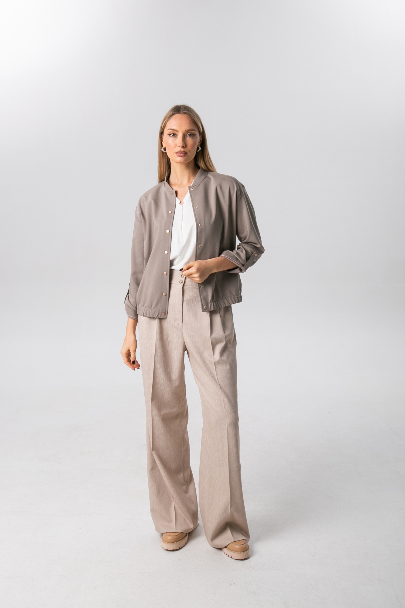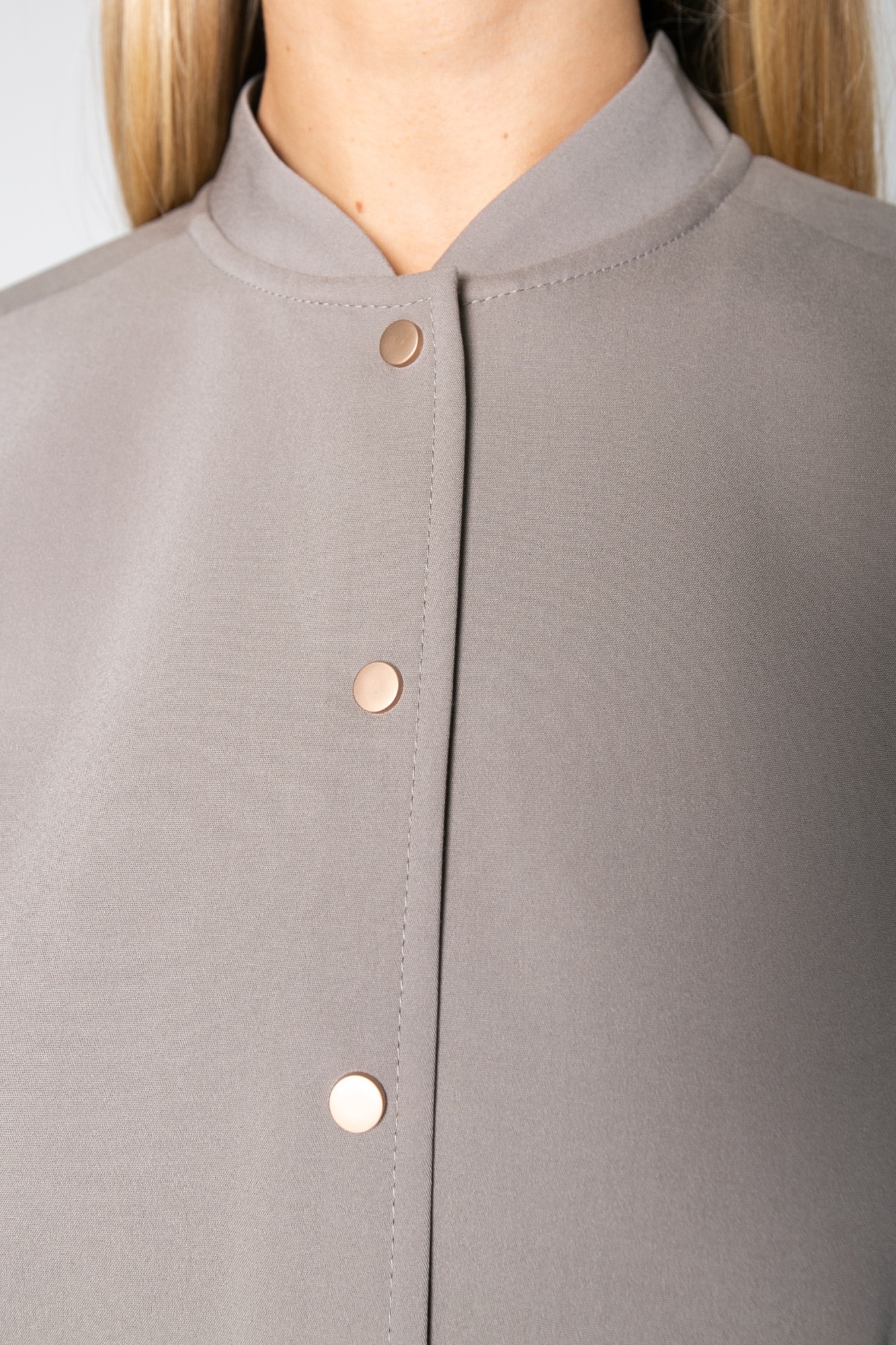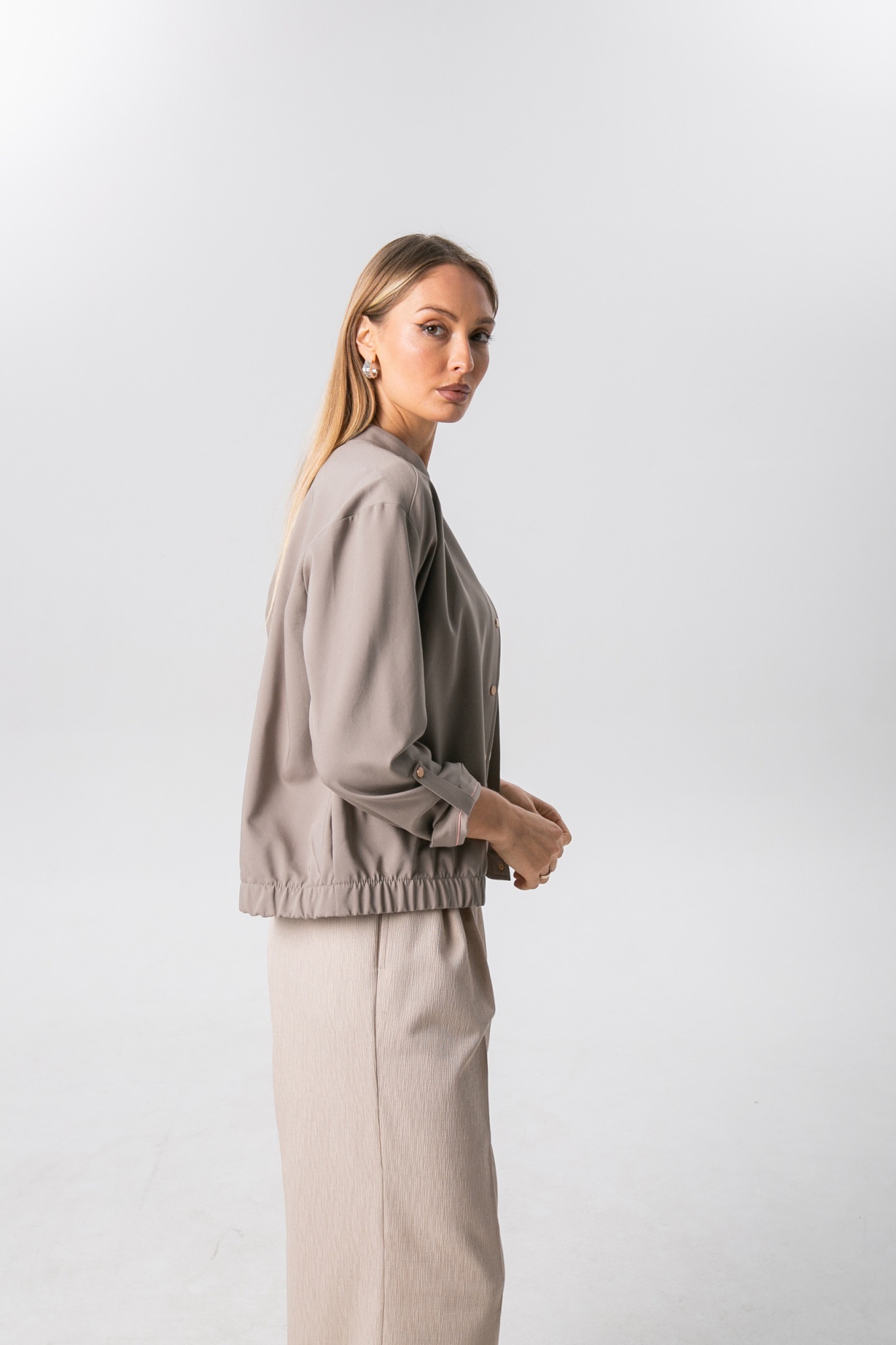 Хлопковый жакет , пошитый по типу бомбера , станет отличной альтернативой классическому жакету или ветровке. Модель свободного силуэта с длинным рукавом и застежкой на кнопки. Рукав можно сделать 3/4 , за счет хлястика. Жакет имеет красивый серо-бежевый цвет , который является базовым и отлично сочетается с другими цветами.