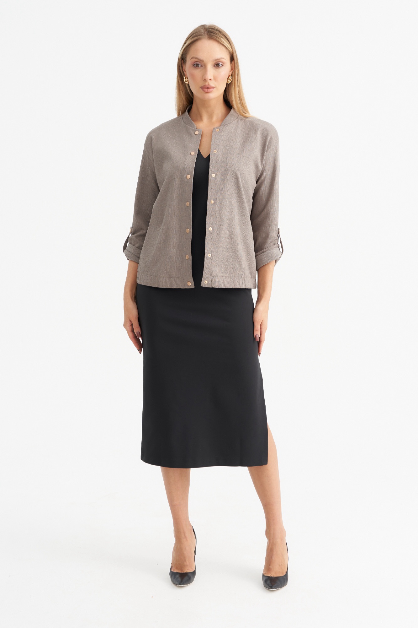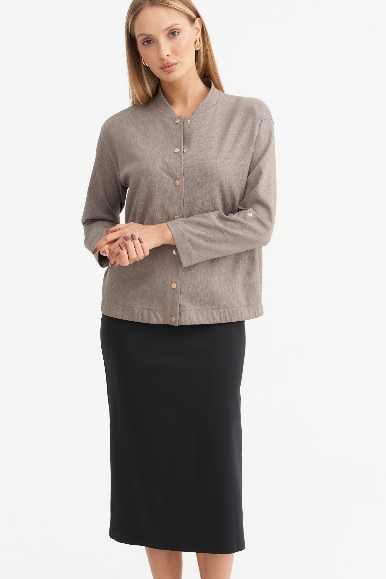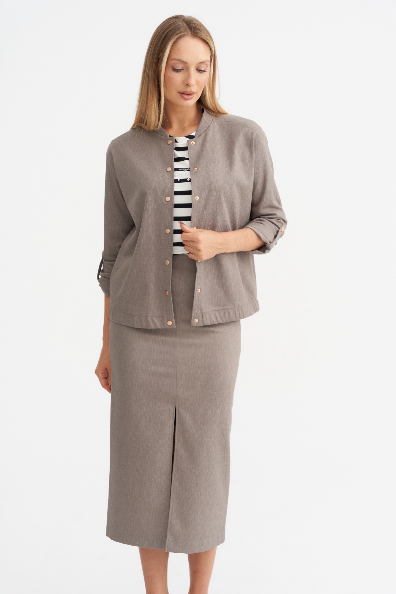Лёгкий жакет , пошитый по типу бомбера , станет отличной альтернативой классическому жакету или ветровке. Модель свободного силуэта с длинным рукавом и застежкой на кнопки. Рукав можно сделать 3/4 , за счет хлястика. Жакет имеет красивый серо-бежевый цвет , который является базовым и отлично сочетается с другими цветами.