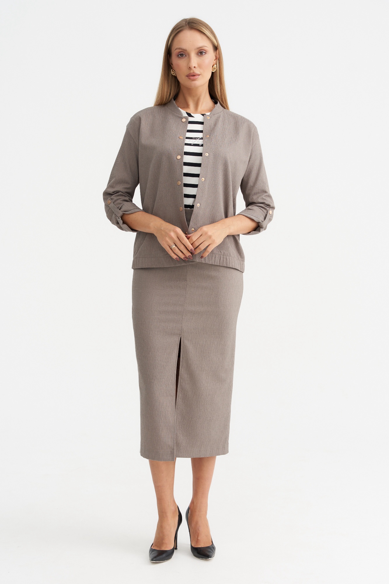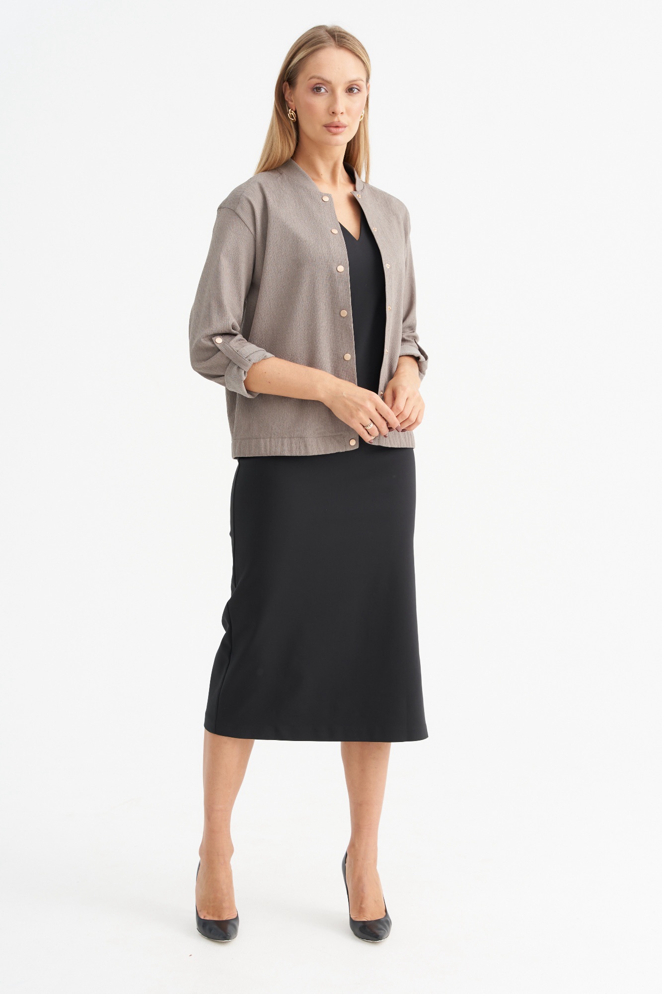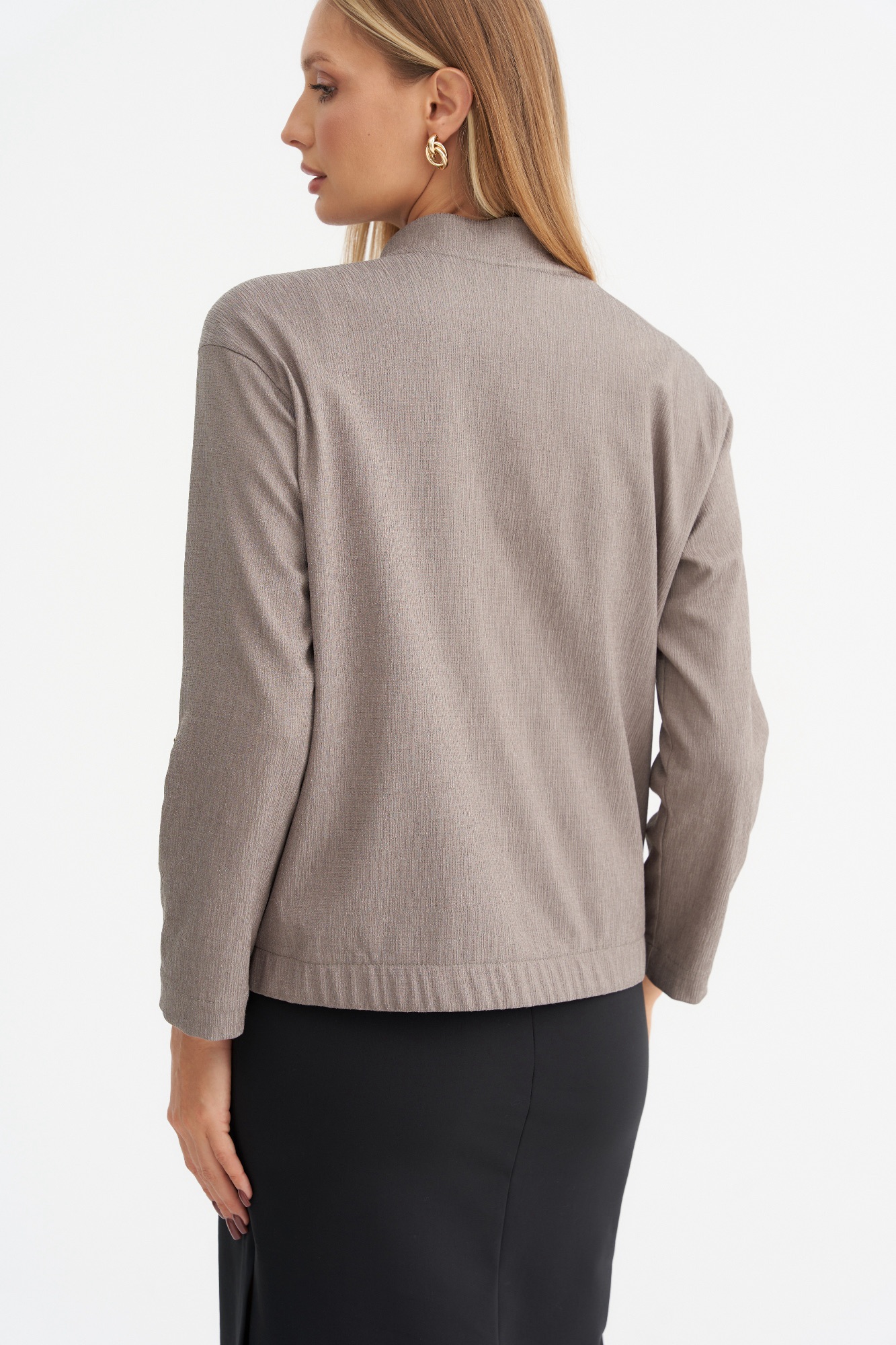 Лёгкий жакет , пошитый по типу бомбера , станет отличной альтернативой классическому жакету или ветровке. Модель свободного силуэта с длинным рукавом и застежкой на кнопки. Рукав можно сделать 3/4 , за счет хлястика. Жакет имеет красивый серо-бежевый цвет , который является базовым и отлично сочетается с другими цветами.