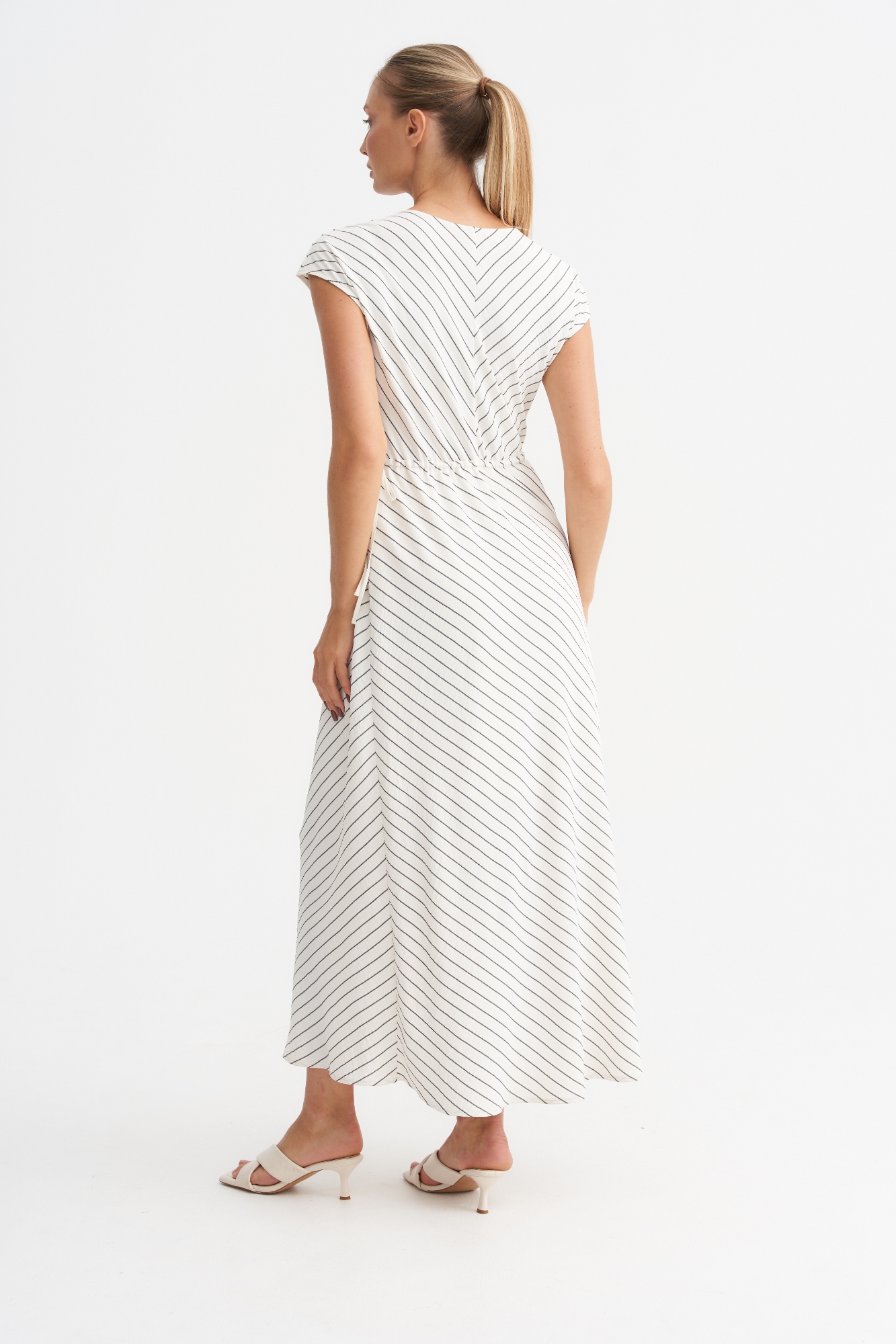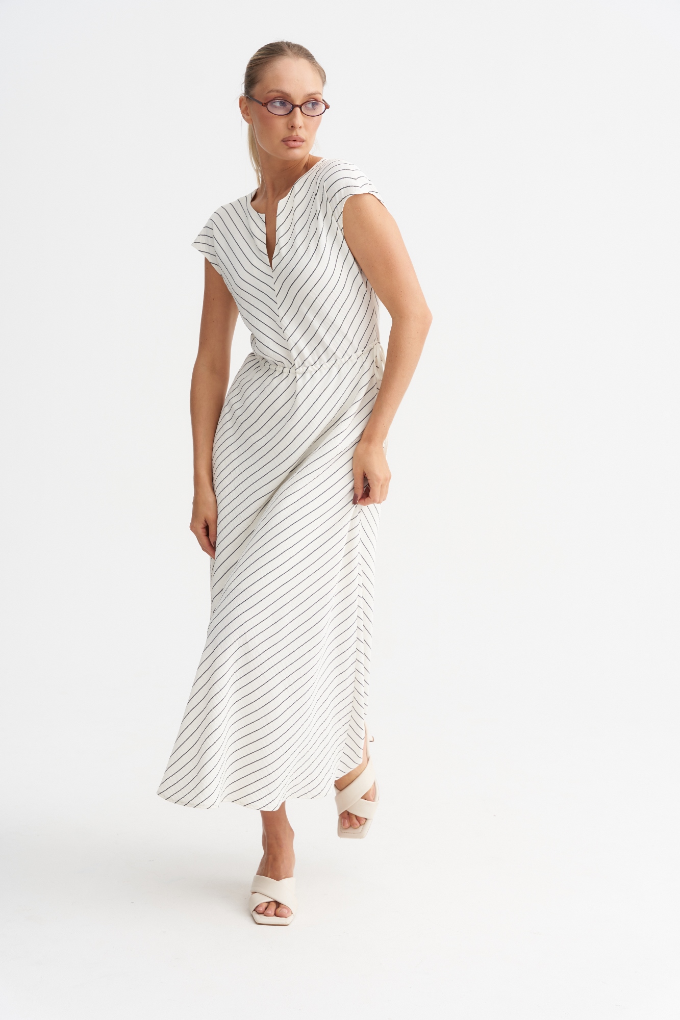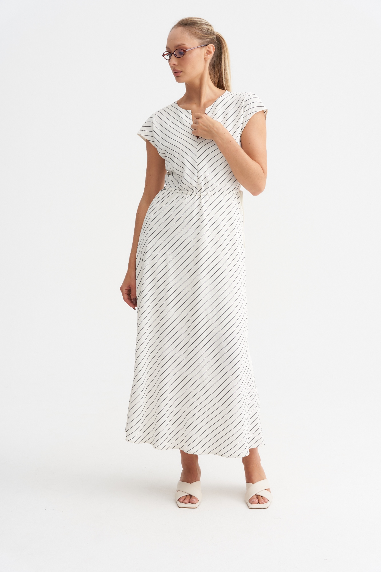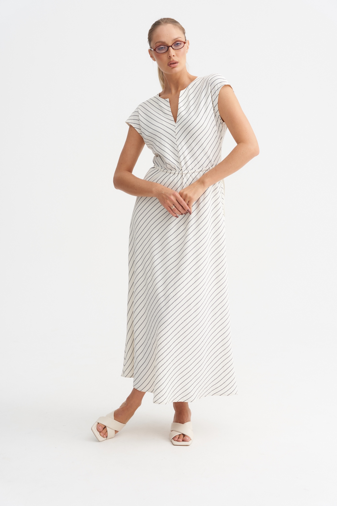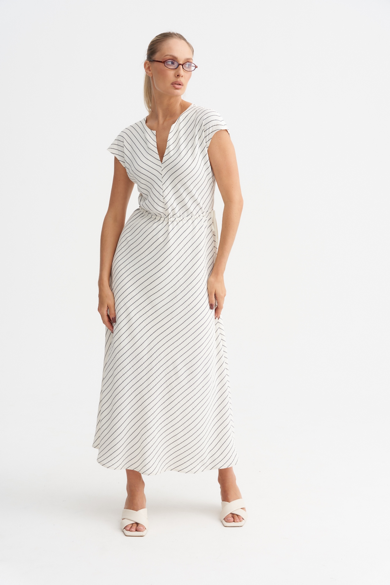 Модель в V-образным вырезом и цельнокроеным рукавом. Полочка скроена таким образом , что рисунок елочкой. Такая комбинация визуально стройнит. Платье имеет А- силуэт и по талии регулируется кулисой. Платье отлично смотрится на фигуре любого размера.