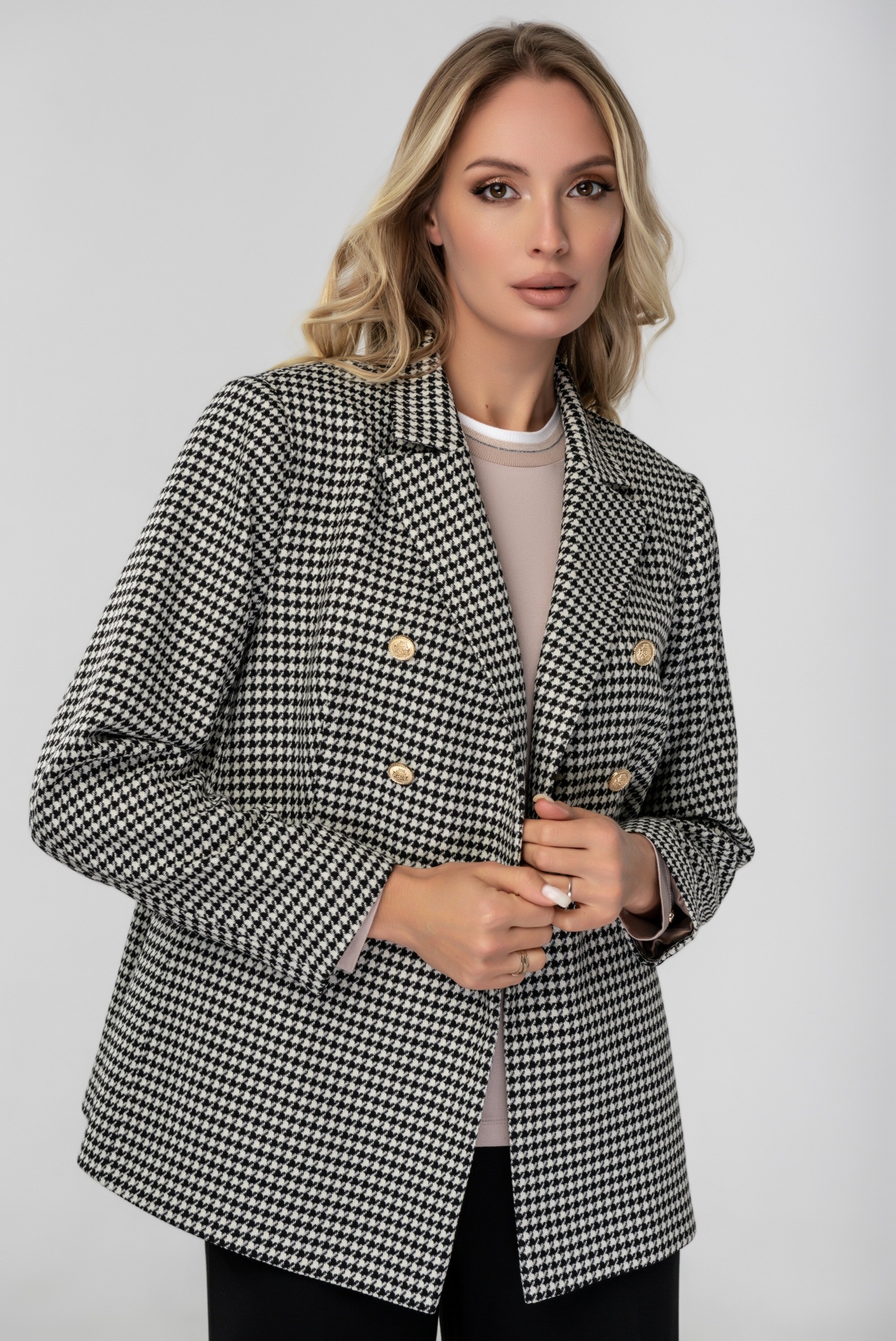 Твидовый жакет с таким принтом - выгодная инвестиция в собственный гардероб. Поскольку принт никогда не теряет своей актуальности, а ткань с таким переплетением нитей - долговечная. Жакет двубортный, имеет современный прямой крой.