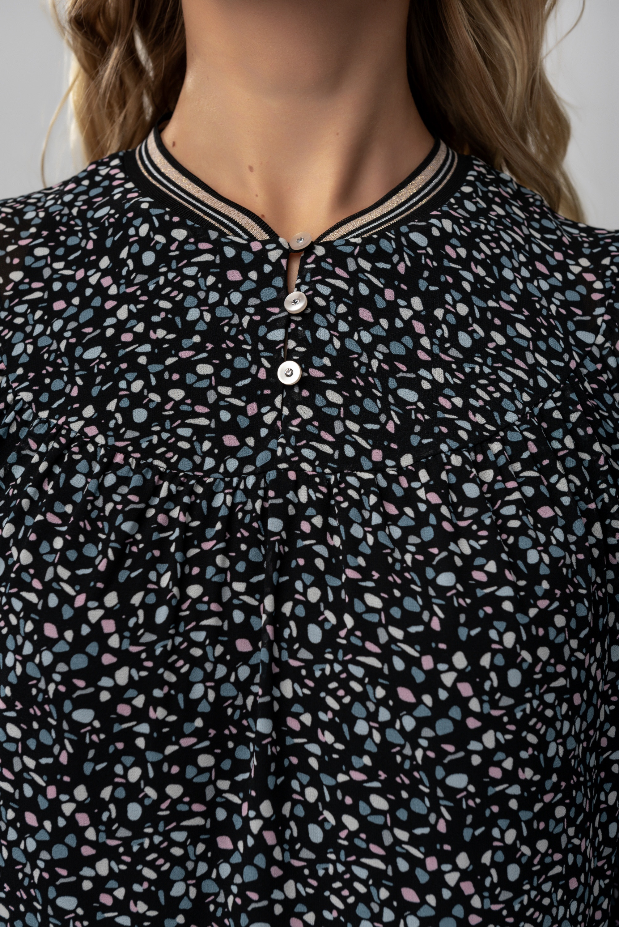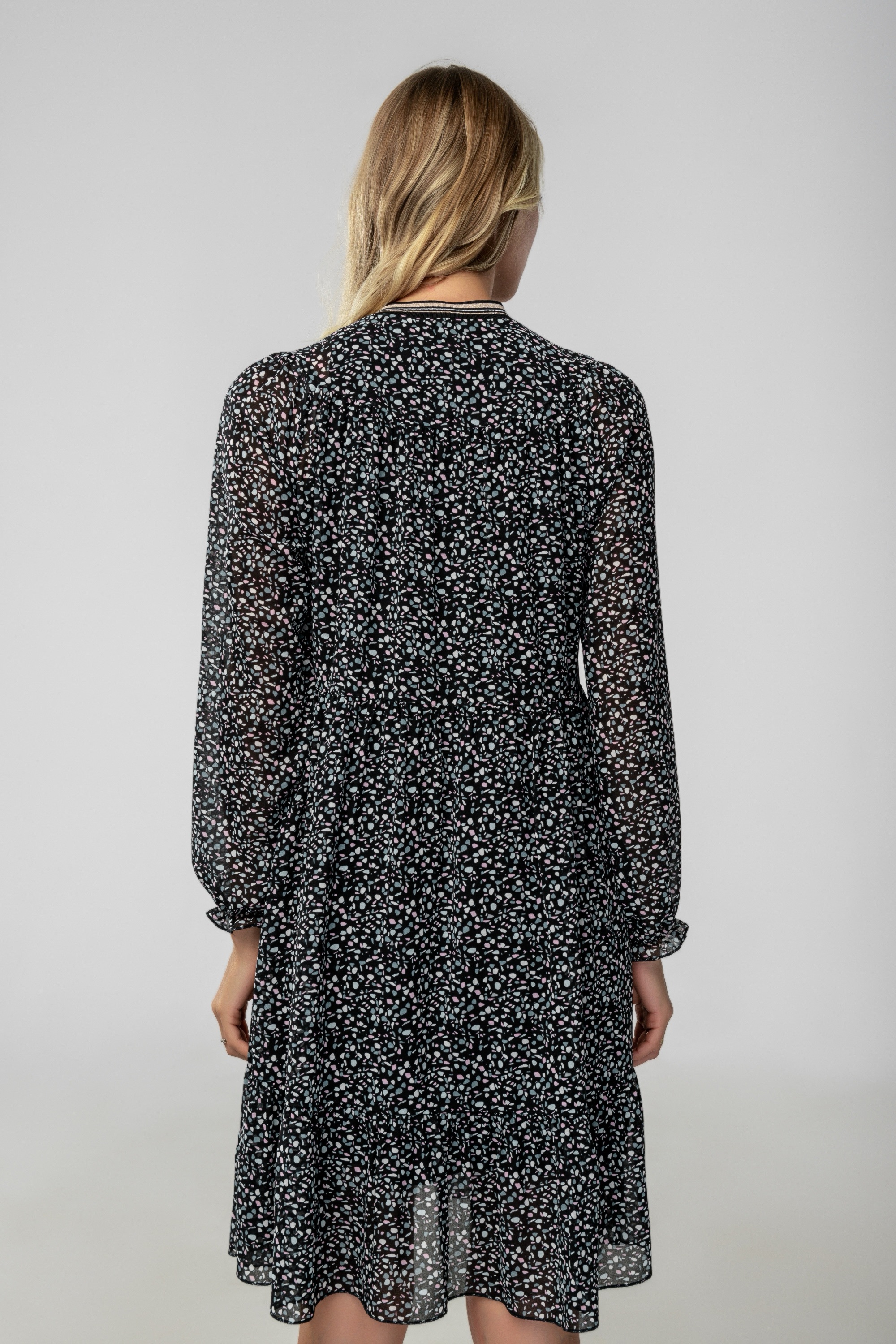 Платье имеет воротник стойку, декорированную пуговицами, отрезную линию талии с мягкой сборкой и свободный низ с оборкой.