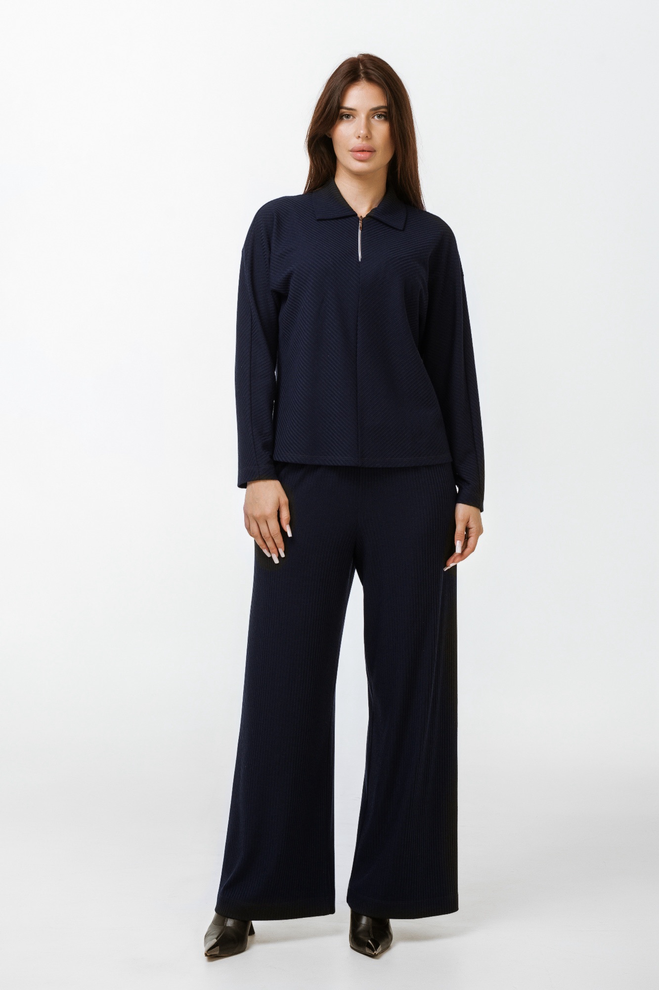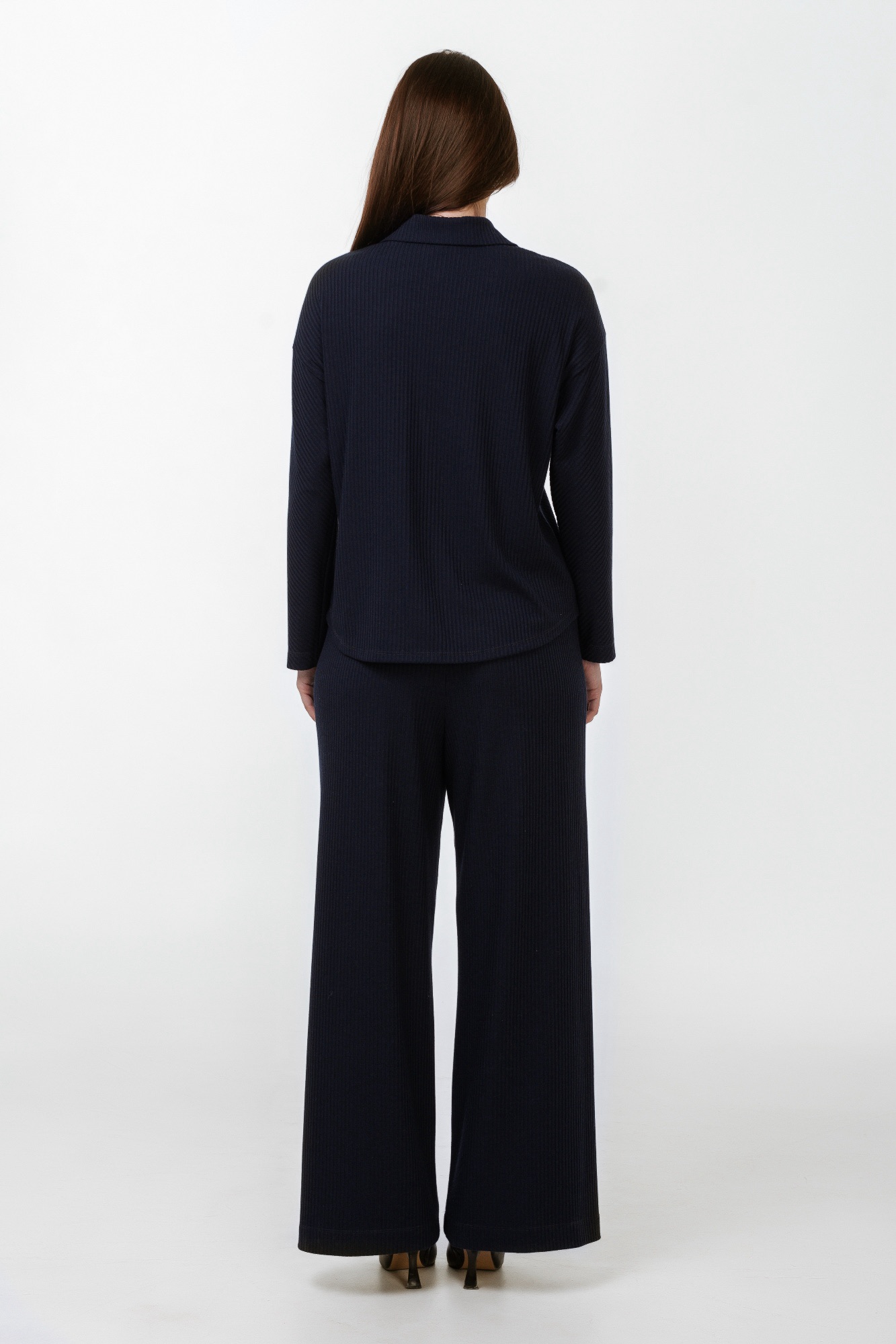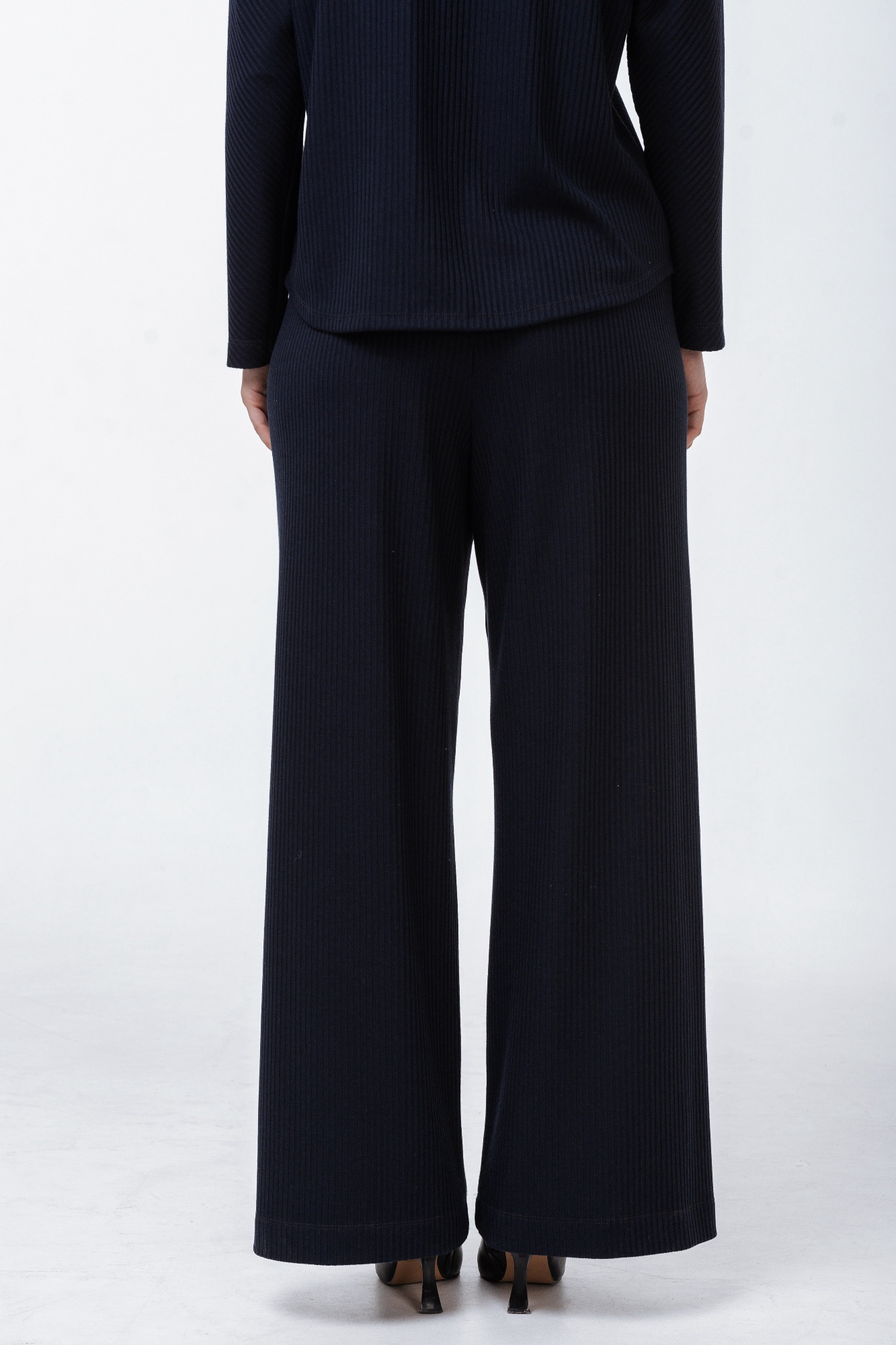 Свободные брюки палаццо из трикотажной ткани в рубчик. Пояс на резинке. За счет вертикального рисунка( рубчик ) визуально стройнят и вытягивают силуэт. В комплект можно приобрести джемпер арт.09056. Получится стильный городской комплект.