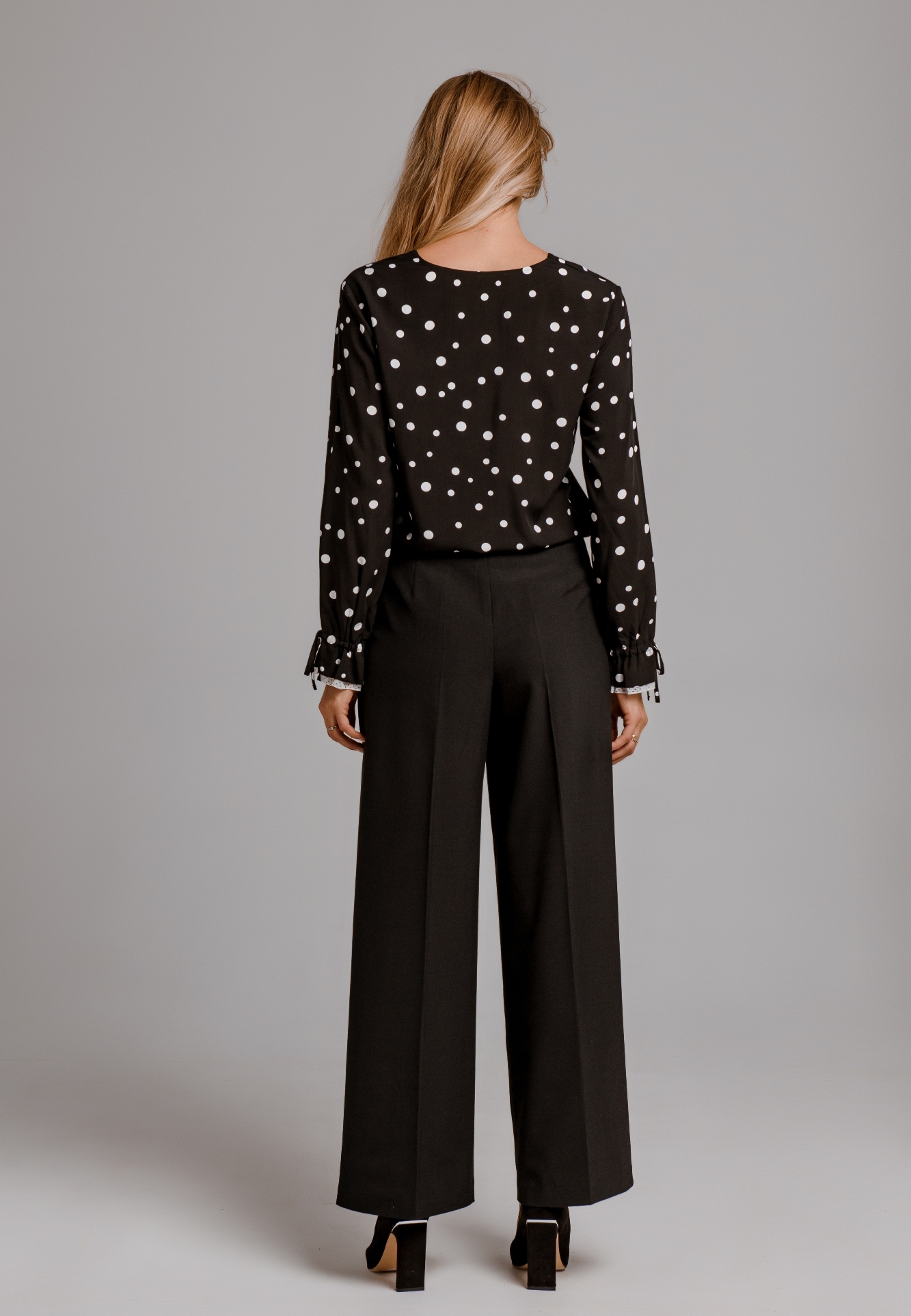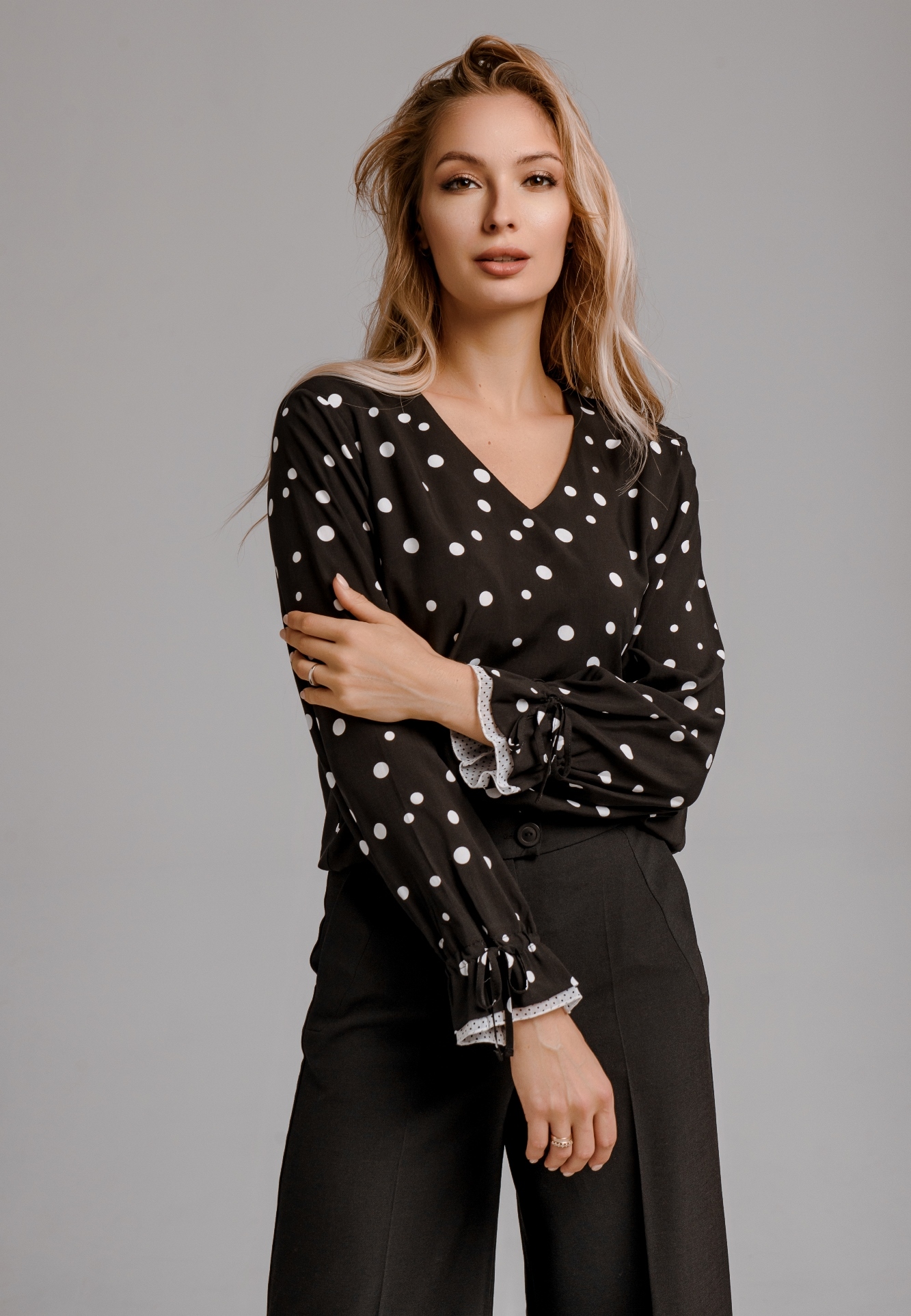 Невероятно женственная блуза в горох дополнит ваш образ на любой случай! Модель прямого кроя с V-образным вырезом горловины. Рукав широкий , по низу регулируется кулисой, образуя рюшу. Блузку можно носить в любой сезон. Отлично сочетается, как с юбками, так и с брюками.