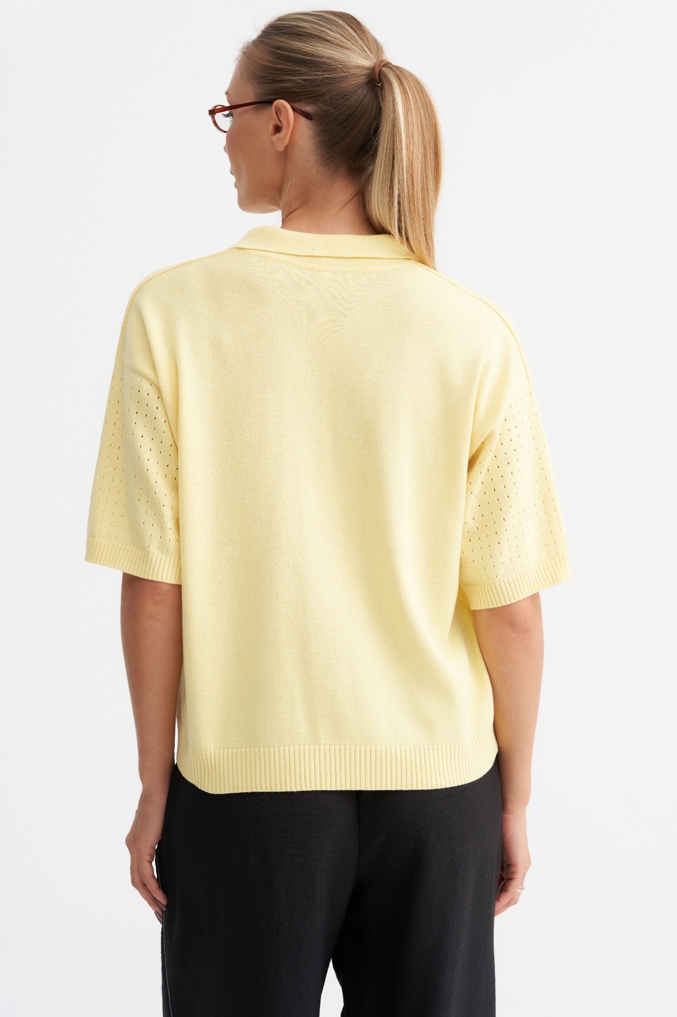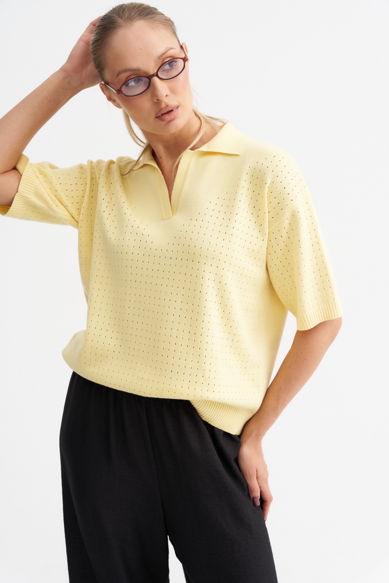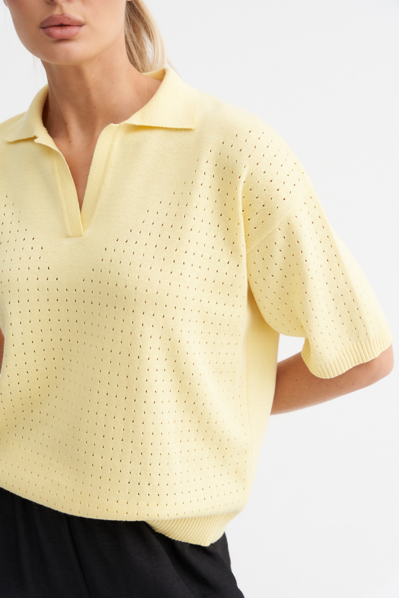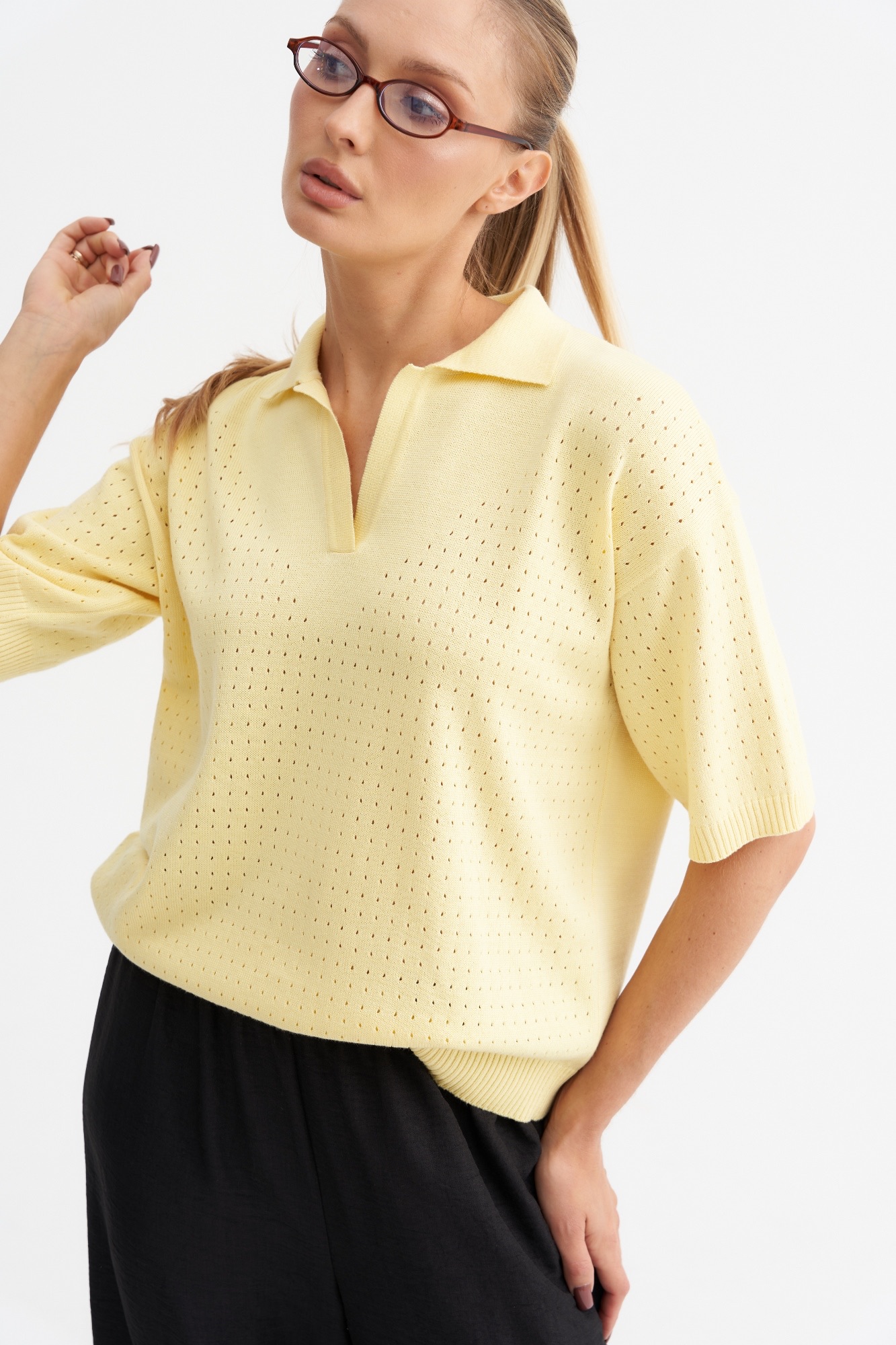 Стильный джемпер-поло может стать базовым в весенне-летнем гардеробе . Джемпер умеренный оверсайз с фактурной вязкой по передней части и свободным рукавом. Рубашечный воротник и вырез хорошо корректирует линию шеи. Отличный состав позволит чувствовать себя комфортно в любое время года.